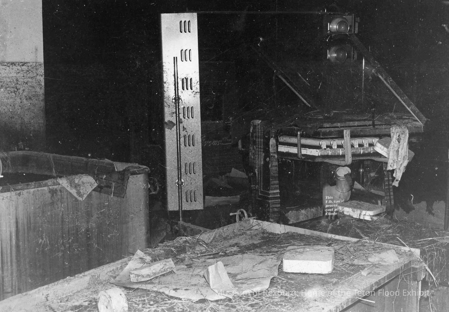 This B&W interior shot is very dark. This could be part of the Standard Journal, or a business that did screen printing (???) as there is a machine to the right of the photo that could be a screen printer. In the middle of the photo is a piece of metal connected to a rod. It looks like a locker-type contraption, as there are vents in it, but it might have been pushed sideways during the flood. To the left of this is a large vat full of liquid. Over the edge of it are draped some papers or cloths, though one looks like a newspaper. In the foreground is a table covered with papers, mud and straw. Mud & straw is visible elsewhere in the photo. This photo is 5.5x7". This photo comes from the old Standard Journal Warehouse located at 23 S 1st E.