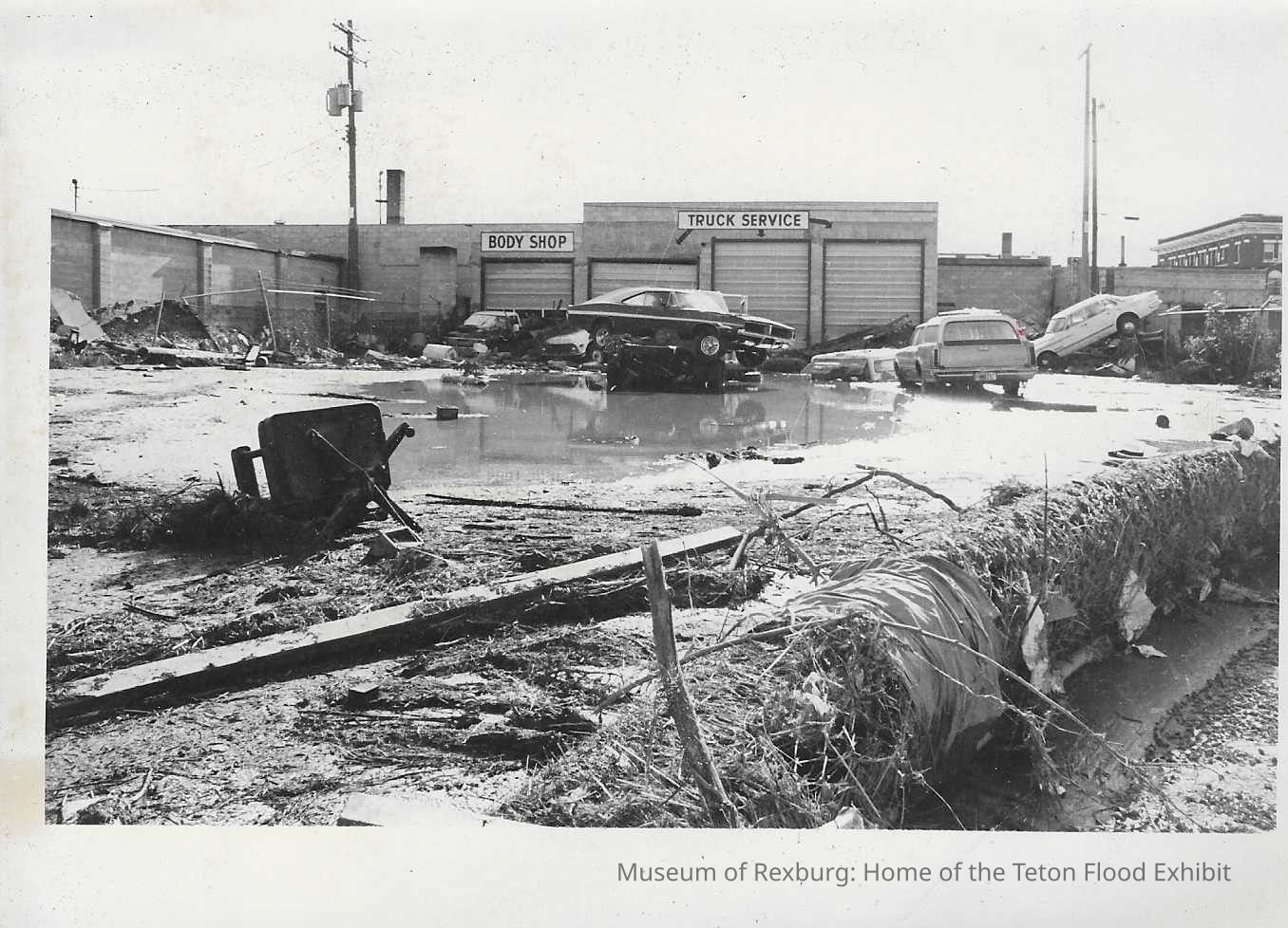 This photo is in black and white and shows flood debris and stagnant water in front of a Truck Service and Body Shop. We can see trees, a rolling chair, and quite a few cars in front of the business. This photo is 5 x 7 inches big. On the back of this photo it reads, "Liesin Shamble 250%". On the bottom left hand corner there is a 90% and the number 7. This photo comes from the old Standard Journal Warehouse located at 23 S 1st E.