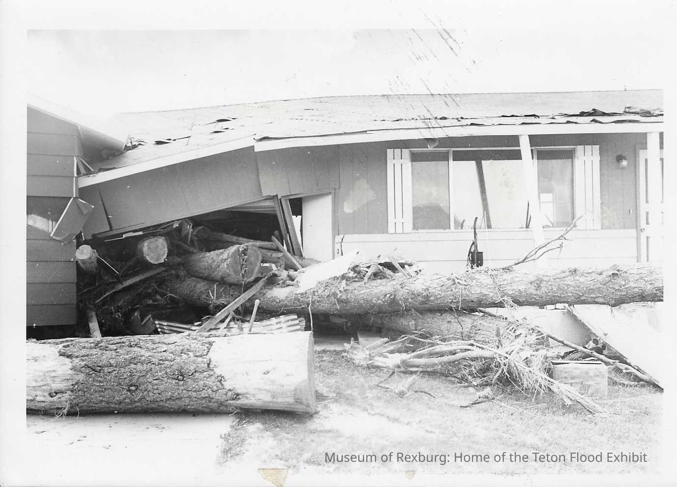 This photo is black and white and shows multiple logs that are rammed into a house. These are large logs that have been rammed into a house. This photo is 5 x 7 inches big. This photo comes from the old Standard Journal Warehouse located at 23 S 1st E.
