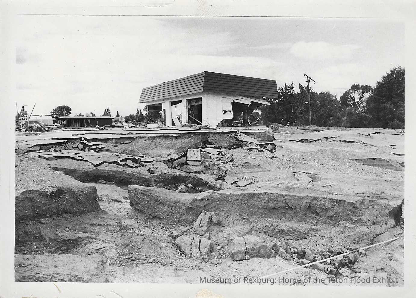 This photo is black and white and shows a building that has been hit and damaged by the floodwaters. We can also see large gouges in the ground from where the flood waters eroded away large sections of land. On the back of this photo it reads, "Rexburg N. Highway 6 col p. 13 'No Gas Here' 225%". This photo is 5 x 7 inches big. This photo comes from the old Standard Journal Warehouse located at 23 S 1st E.