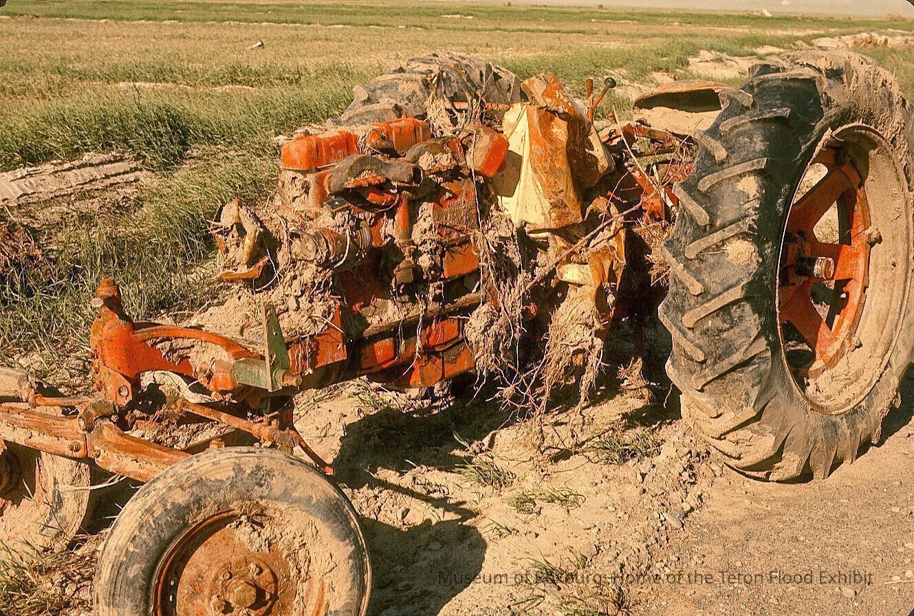 This photo was taken in colour. The subject of the photo is a small red tractor. It takes up the fore and midground portions of the shot, leaving a grass filled field as the background. The red tractor is covered in mud, and foliage debris. The back tires of the tractor are large, whereas the front tires are small. The seat and other parts of the tractor have been stripped off. It is however, in decent condition. The photo is a part of a digital collection donated to the museum by Rick Davis.