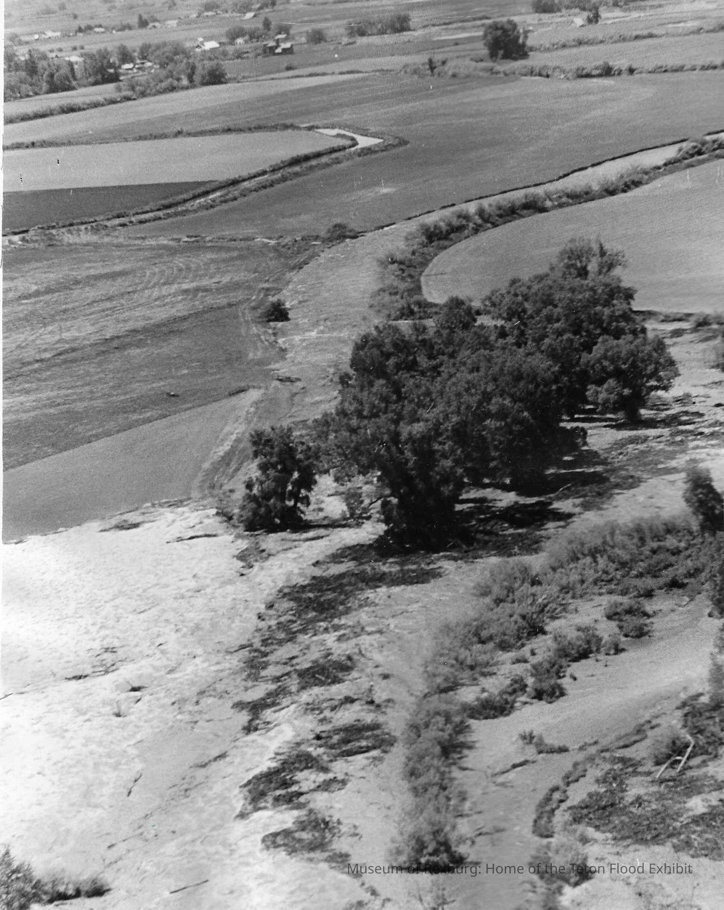 This photo is black and white and shows the flood waters overflowing what appears to be a canal and headed into neighboring farmer's fields. There are also homes in the background of this photo. There is lots of foliage in the foreground of this photo. This photo is in portrait position. This photo is also 7.25 x 9.25 inches big. This photo comes from the old Standard Journal Warehouse located at 23 S 1st E.