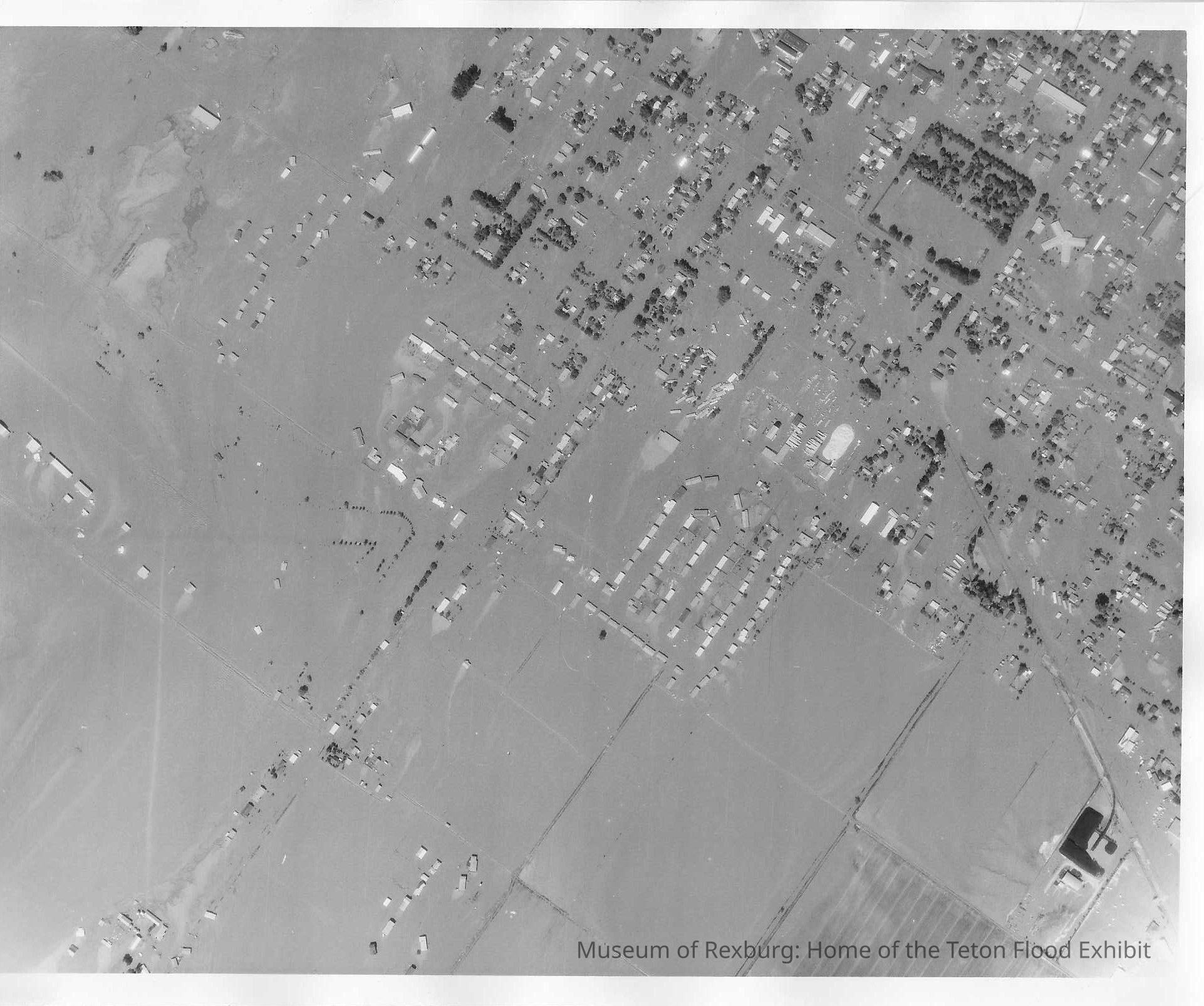 This photo is an 8x10 black and white photo of the flood. On the back it says Town/Petro A/C 902 5 June 76 1645 T KS 87 Rexburg, Idaho in black marker. The top right corner has the buildings and then it is more sparse down to the left hand corner and there are more fields.