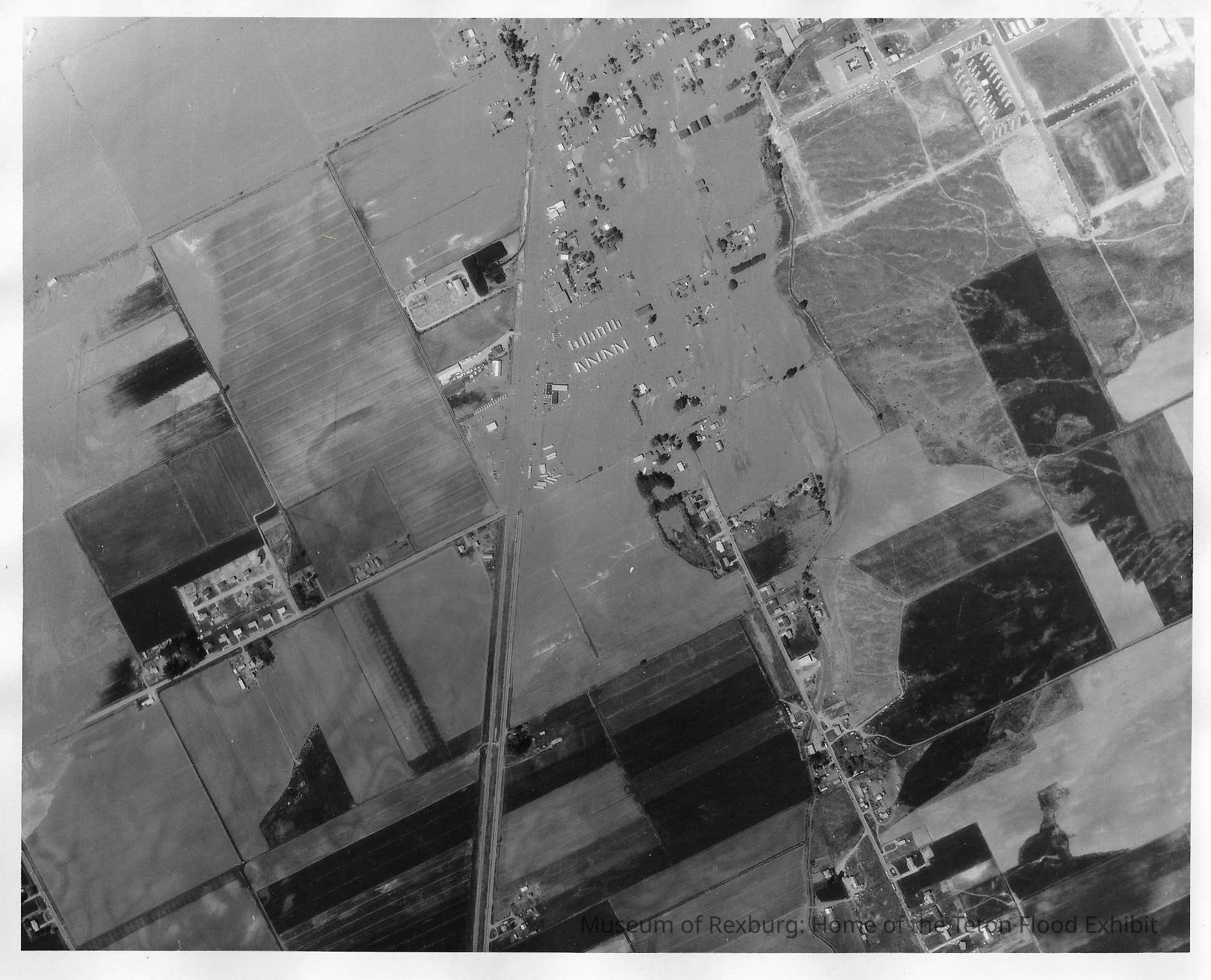 This photo is an 8x10 black and white photo. It says Town/Petro A/C 902 5 June 76 1645 T KS 87 Rexburg, Idaho on the back in blue marker. It is an aerial view of the highway and shows the areas that were flooded from this view.