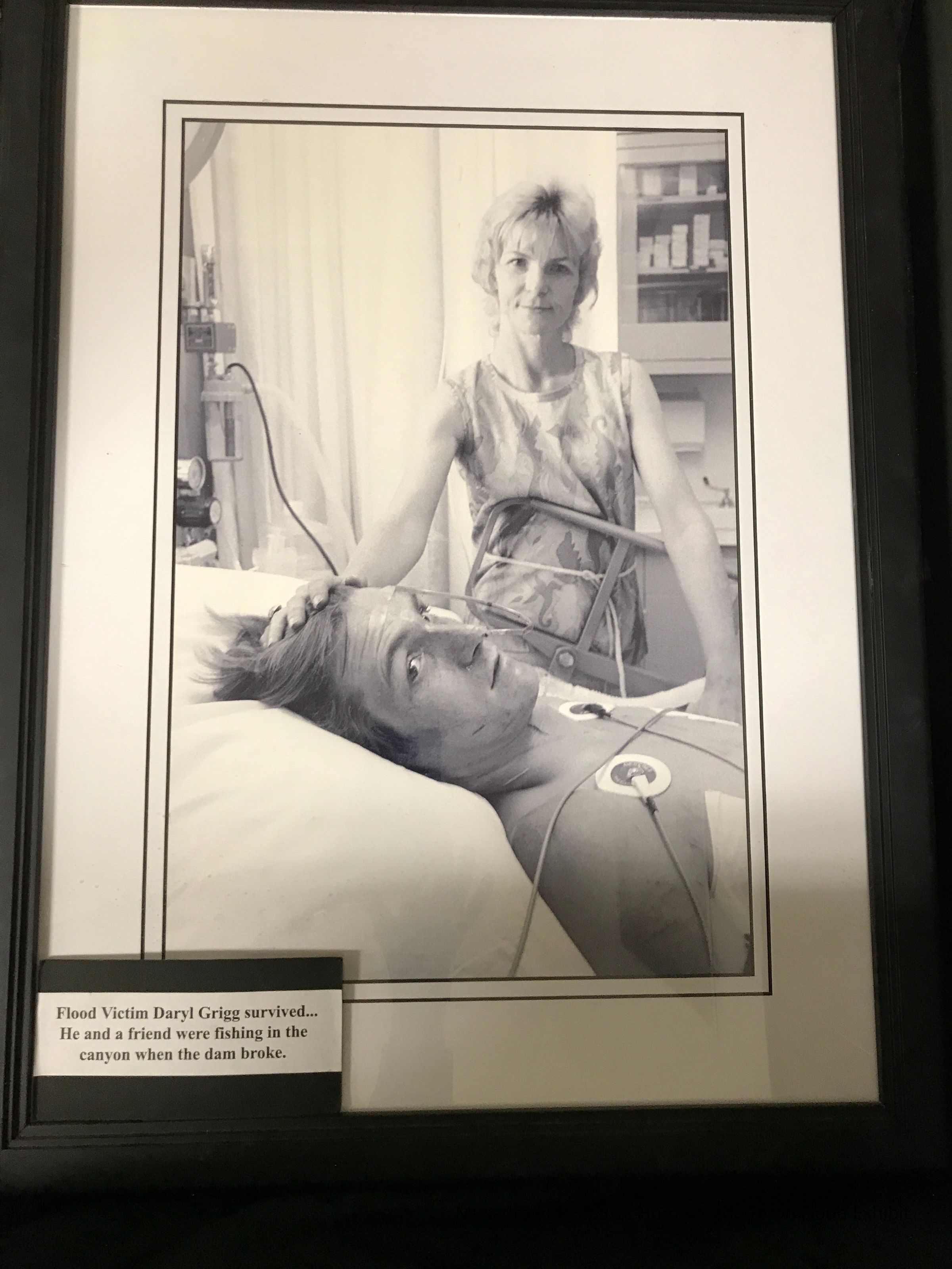 This picture is in a black frame with white borders around the picture. The frame is 26.5 x 19.75 inches. The photo shows the flood victim Daryl Grigg in a hospital bed with bandages and monitors on him and a woman standing next to him with a hand on his head. It is a black and white photo.