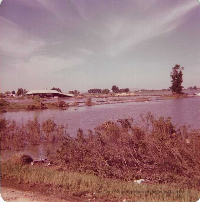 This photo is in color and shows a large lake of water. It is uncertain whether this was a lake previous to the flood or if this was created by receding flood waters. To the left of the photo is a large white piece of debris that looks like it has been overturned. There is lots of debris in the photo and the bushes look like they have been laid flat at some point due to water. This photo is 3.5 x 3.5 inches big.