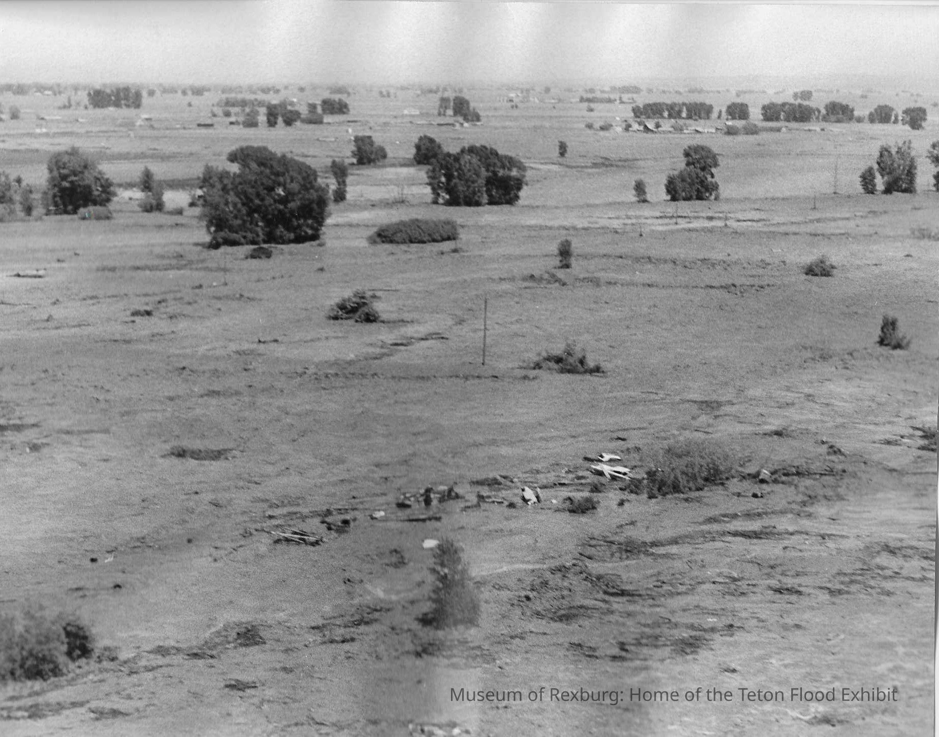 This photo is black and white and shows an area that is covered in flood water. There is also lots of debris that is floating in the water towards the front of the photo. This photo is 7.25 x 9.25 inches big. This photo comes from the old Standard Journal Warehouse located at 23 S 1st E.