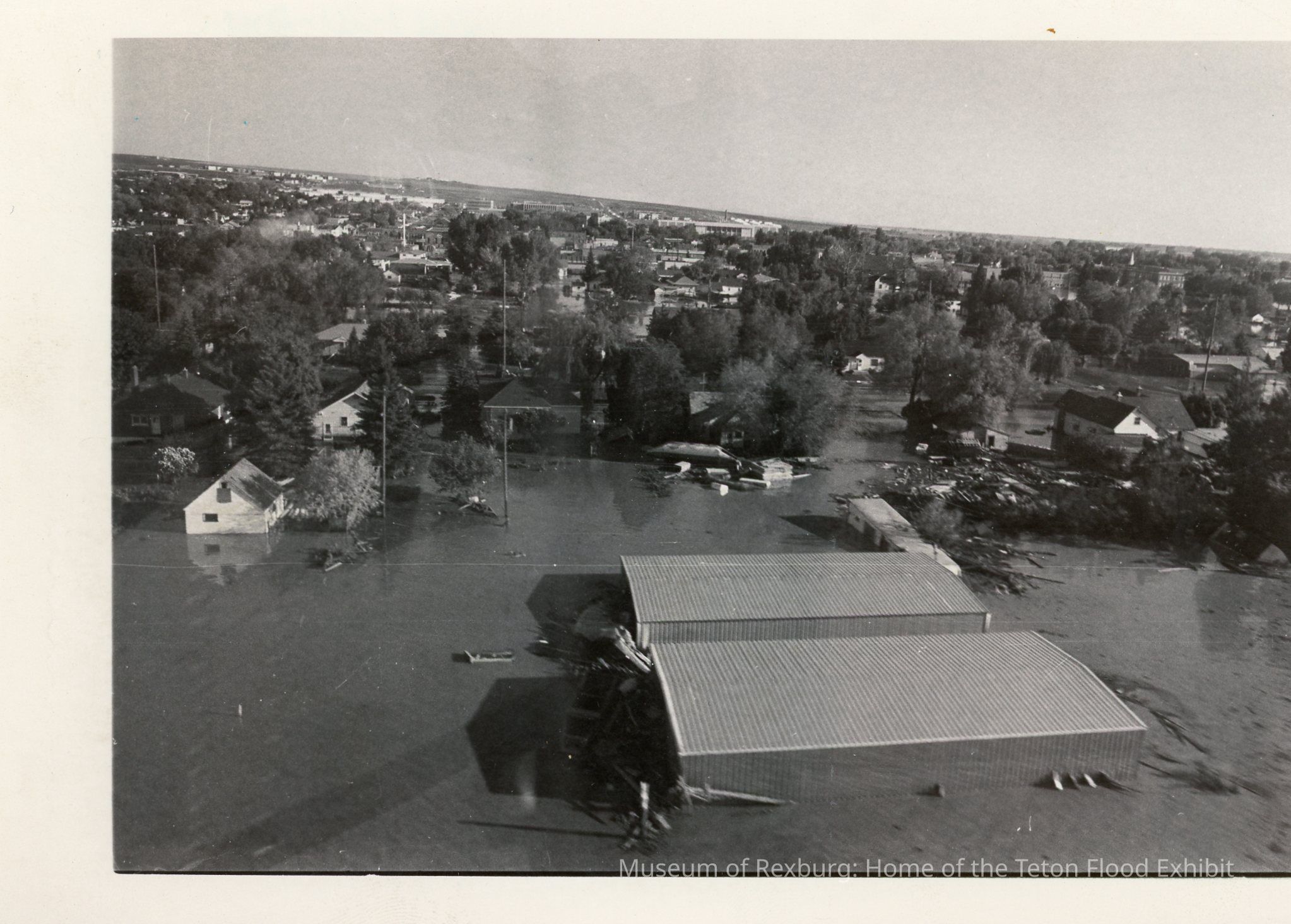 The photo is in black and white. The subject of the photo is a city that was hit by the 1976 flood. In the foreground of the photo are two storage facilities. They seem to be made of metal. The rest of the city is sprawled out through the background and it seems to be underwater as well. The dimensions of the photo are 5" X 7". This photo comes from the old Standard Journal Warehouse located at 23 S 1st E.