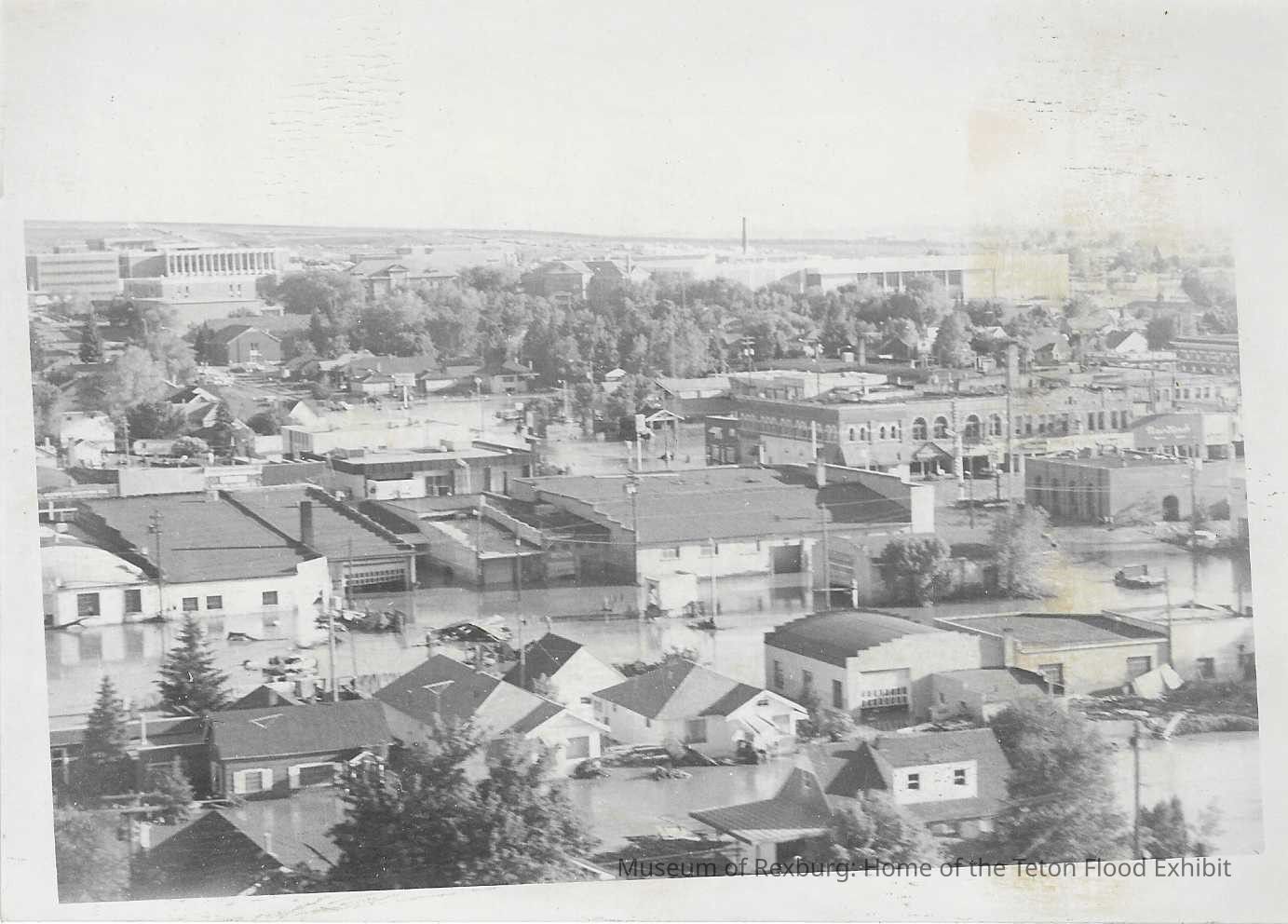 This photo is in black and white and shows a city and how it has been flooded by the Teton Dam Flood. This photo is 5 x 7 inches big. This photo comes from the old Standard Journal Warehouse located at 23 S 1st E.