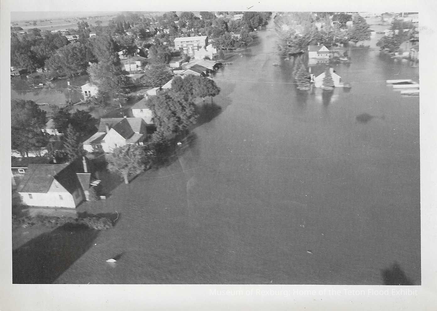 This photo is black and white and shows how many homes have been flooded by the flood waters. We can also see many other roads that have been flooded as well. This photo is 5 x 7 inches big. On the back of the photo there are the notes, "150%", "used", and "3". This photo comes from the old Standard Journal Warehouse located at 23 S 1st E.