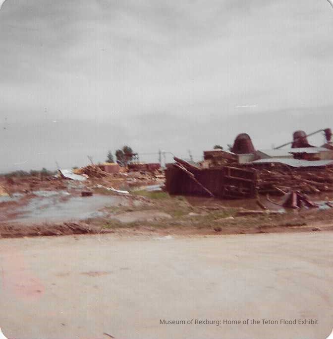 This photo is in color and shows flood water and flood damage in a neighborhood. There are lots of trees in the background and the majority of the homes are located on the right side of the photo. The foreground is full of mud, water, and debris. This photo is 3.5 x 3.5 inches big.