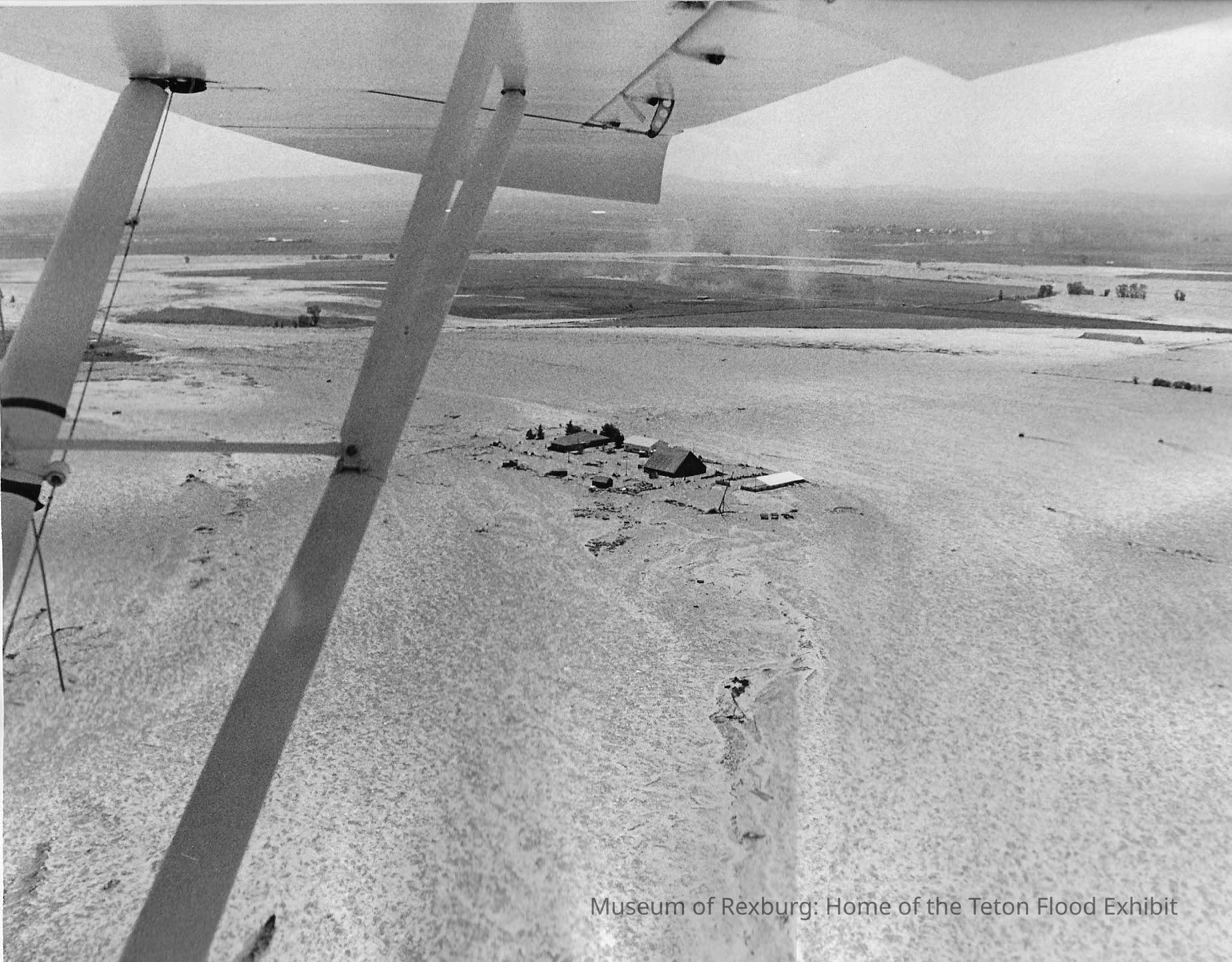 The photo is in black and white. The subject of the photo is a farm in the middle of nowhere surrounded by flood waters. The photo is an aerial shot, and was taken from a plane. The wing of the plane is seen from the lower left portion of the photo to the top portion of the photo. The flood waters encapsulated the farm, and seem to be moving towards the top portion of the photo. The dimensions of the photo are 7.25" 9.25". This photo comes from the old Standard Journal Warehouse located at 23 S 1st E.