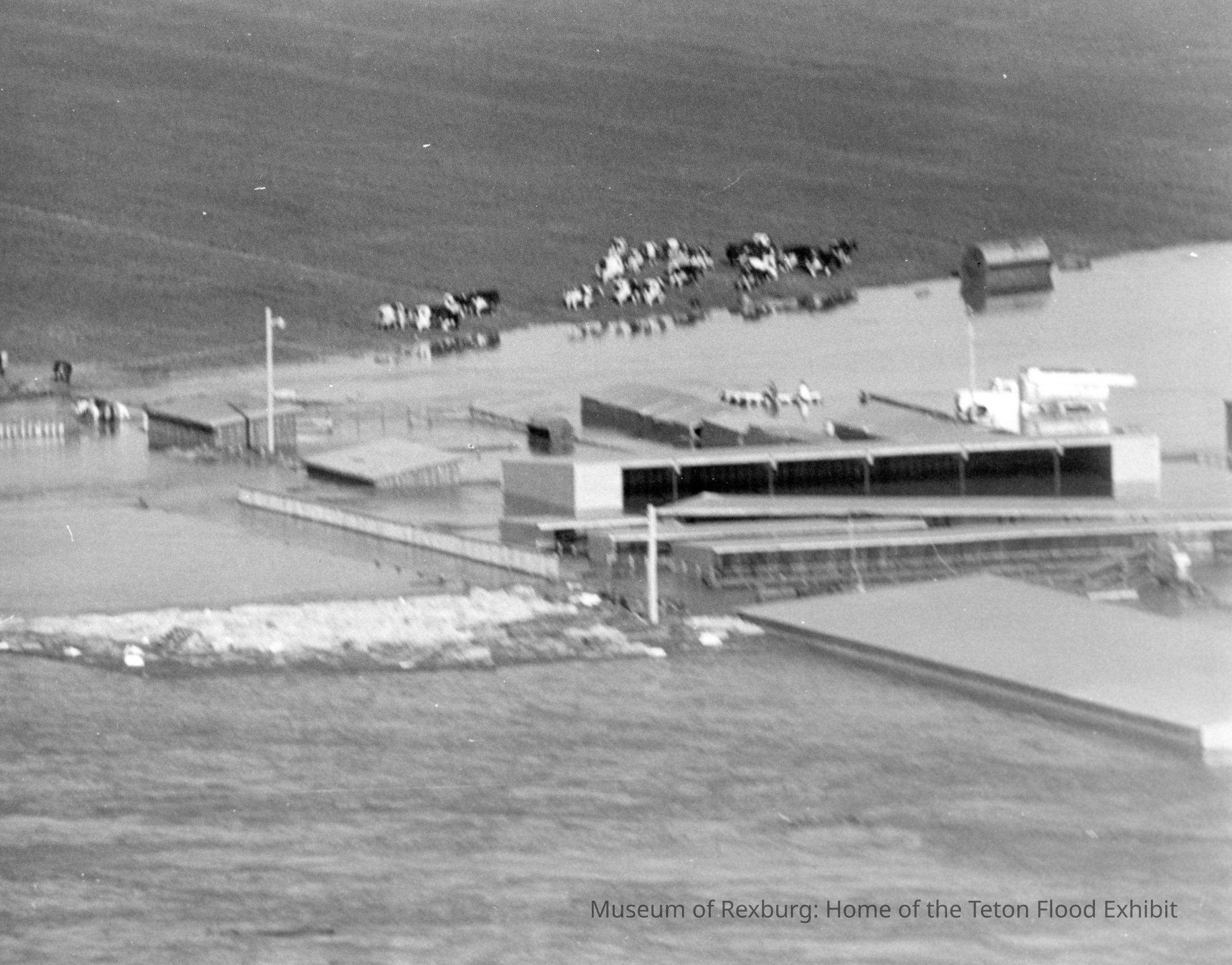 Oblique aerial view of a flooded farm. Pens and outbuildings are in the middle of the photo, with an old barn off to the right. In the background above the line of the water is a heard of Holstein Cows. The whole image is a little blurry. This photo is 9.25x7.25". This photo comes from the old Standard Journal Warehouse located at 23 S 1st E.