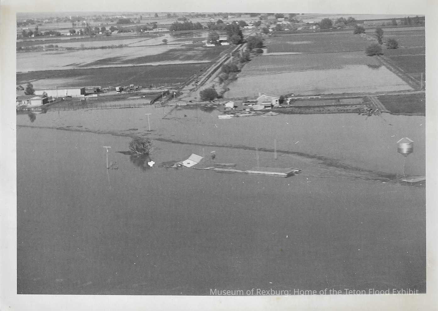 This photo is in black and white and shows flooded roads, farmland, and a homestead. The majority of the foreground is all flood water. This photo is 5 x 7 inches big. This photo comes from the old Standard Journal Warehouse located at 23 S 1st E.