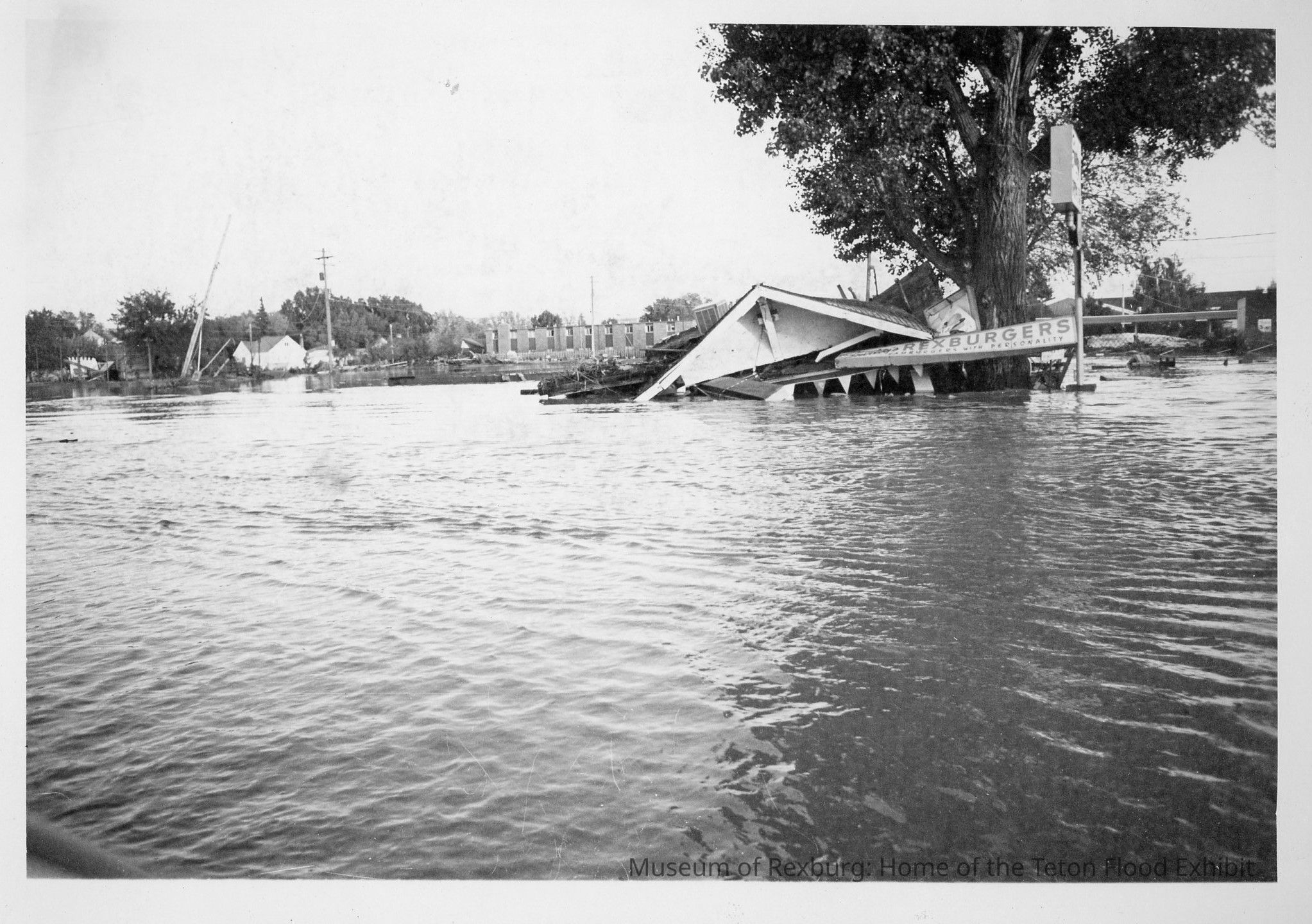 This B&W photo shows a slightly different angle of the flooded Shirley's Drive-in sign & the Rexburger place while still flooded with water. We have an image of this in the slides (1000-20S-068), which is in color & shows the signs in greater detail. This photo is taken from a slight distance, the signs can't be read, but the collapsed roof and the Rexburger sign can be seen. There is water everywhere. Some houses & buildings & trees are in the background. This photo has a small note on the back: "150% 10". This photo is 5x7". This photo comes from the old Standard Journal Warehouse located at 23 S 1st E.