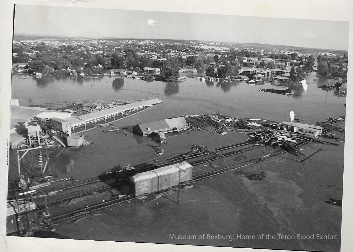 This photo is in black and white and shows many train cars that have been hit by the flood waters. The railroad is also flooded as well. This photo is 5 x 7 inches big. We can also see a flooded town in the background. This photo comes from the old Standard Journal Warehouse located at 23 S 1st E.