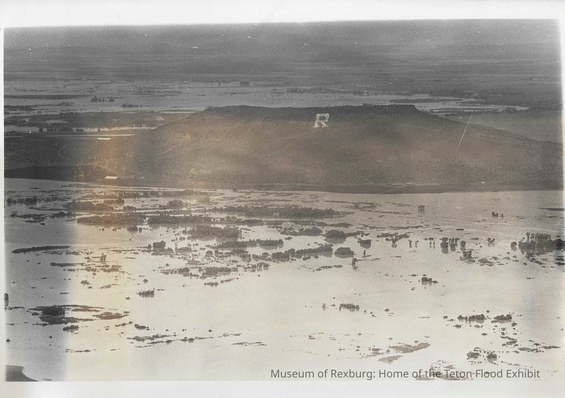 This photo is black and white and shows the "R" Butte in the center as the flood waters splitting and going around the butte. This photo is 8 x 10 inches big. This photo comes from the old Standard Journal Warehouse located at 23 S 1st E.