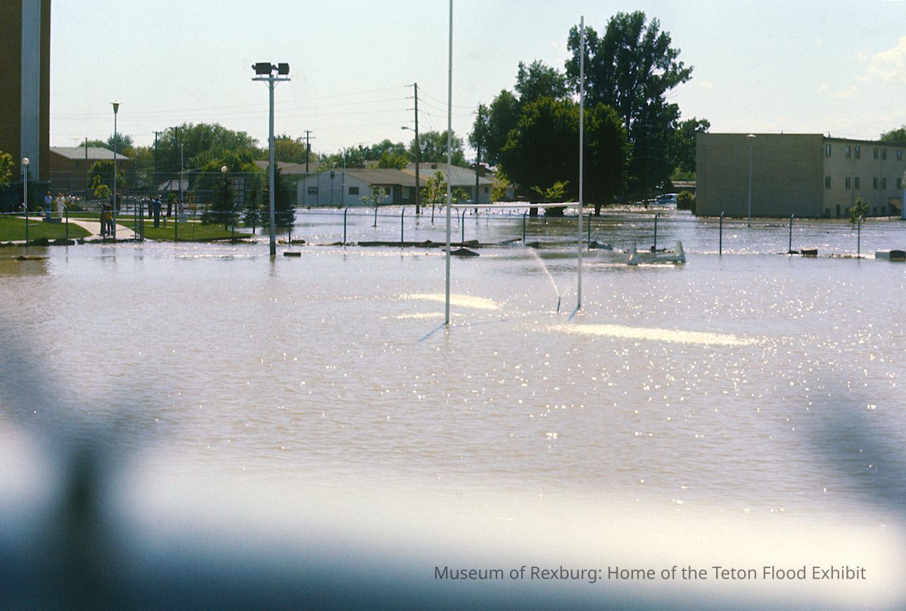 The photo was taken in colour. The subject of the photo is Rick's College's football field after it was submerged under the flood waters. The sprinkler system for the field also seems to be going off. The left hand side of the photo contains the corner of the Hart building. There are people standing at the corner of the Hart Building. The photo is a part of a digital collection donated to the museum by Rick Davis.