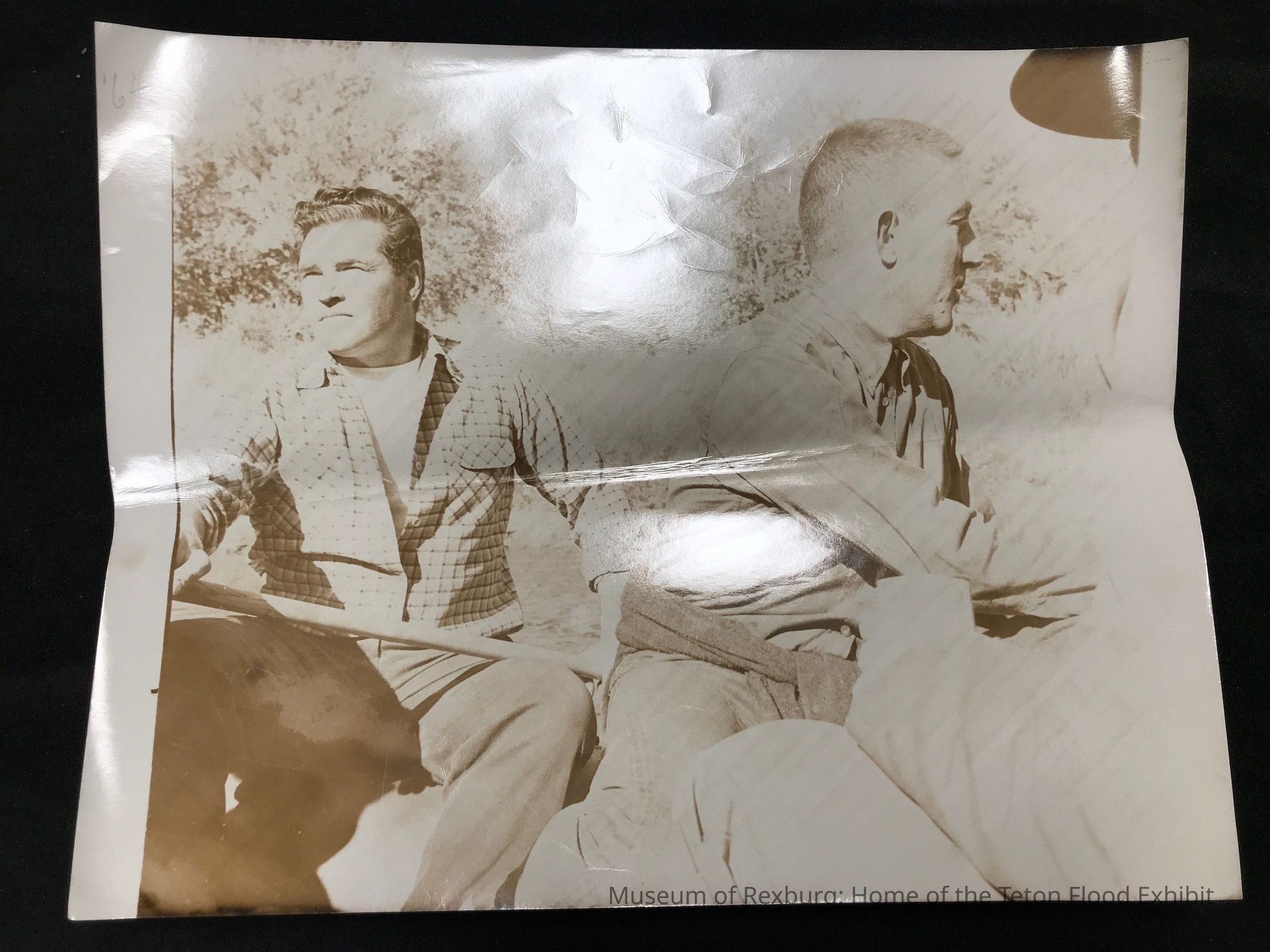 These pictures we are assuming are from the Menan Butte area because one photo contains the Menan Butte a.k.a. the "R" mountain. They can be found in the Mary Smith Archive under folder B14. The folder name these photos were found in the folder B14 with the name "Teton Dam Case Clippings (2)". The name given to these photos in the Mary Smith Archive is "row186.MscPhotos". This photo shows three men in a boat in a river. This photo is very faded and it is difficult to see the subject. They appear to all be wearing plaid shirts except for one on the right hand side. In the background we can see the river bank. This photo is 11 x 14 inches big. There is a number ('64) is written in pencil in the upper left hand corner. This photo is black and white. This photo is associated with: 2020-20-010, 2020-20-012, 2020-20-013, 2020-20-014, 2020-20-015.