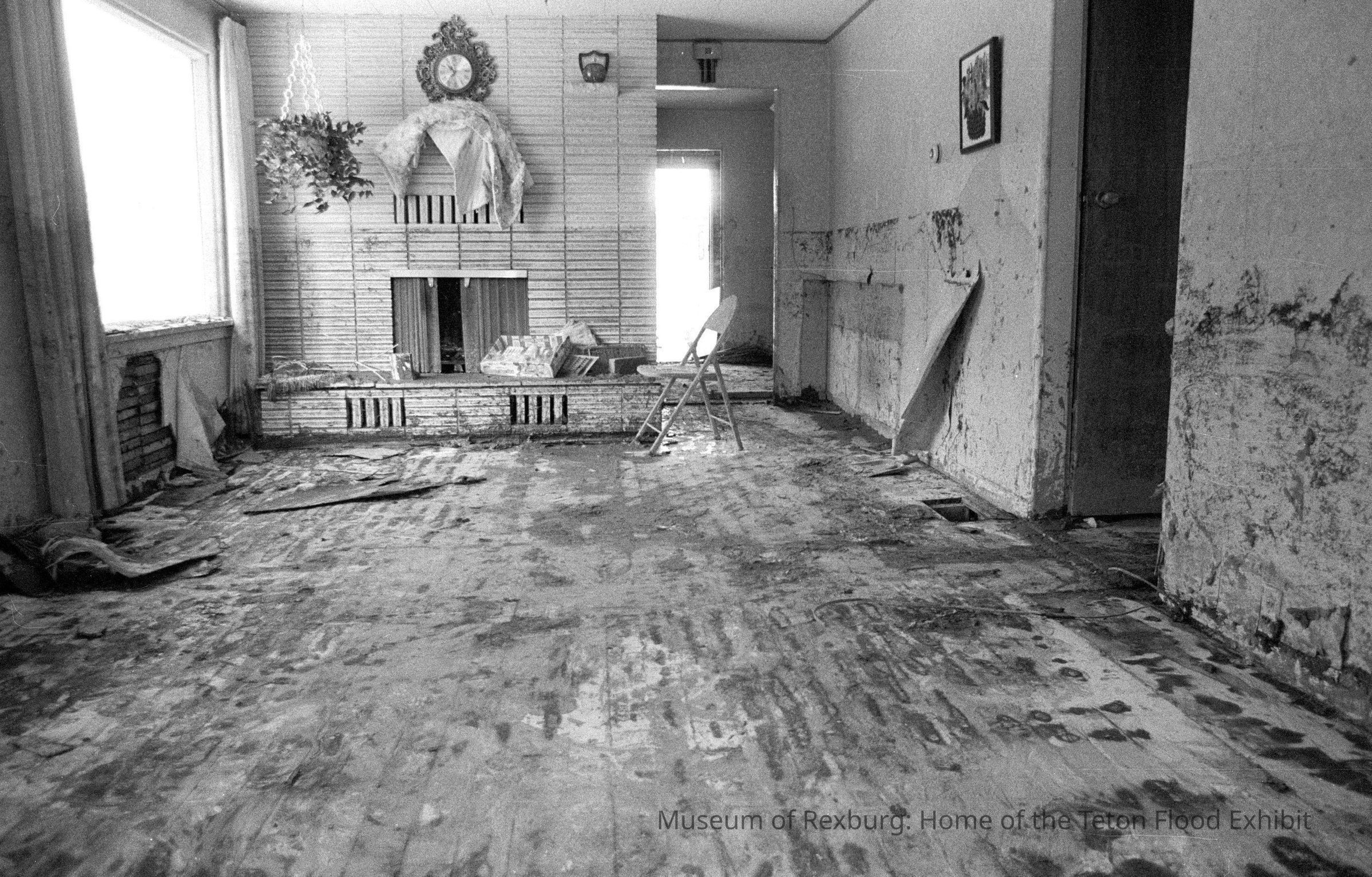 This photo was taken in black and white. The subject of the photo is a living room to a random house that went through the flood. The accent wall appears to be the chimney which is made of a brick of some sort. The other walls seem to be plain plaster walls. The room contains a hanging plant in the left upper corner, above the mantel of the fireplace is an ornate clock. The portion of wall underneath the window is peeling away. The floor looks like it is a wood floor that it speckled with mud. The photo is a part of a digital collection donated to the museum by Rick Davis.