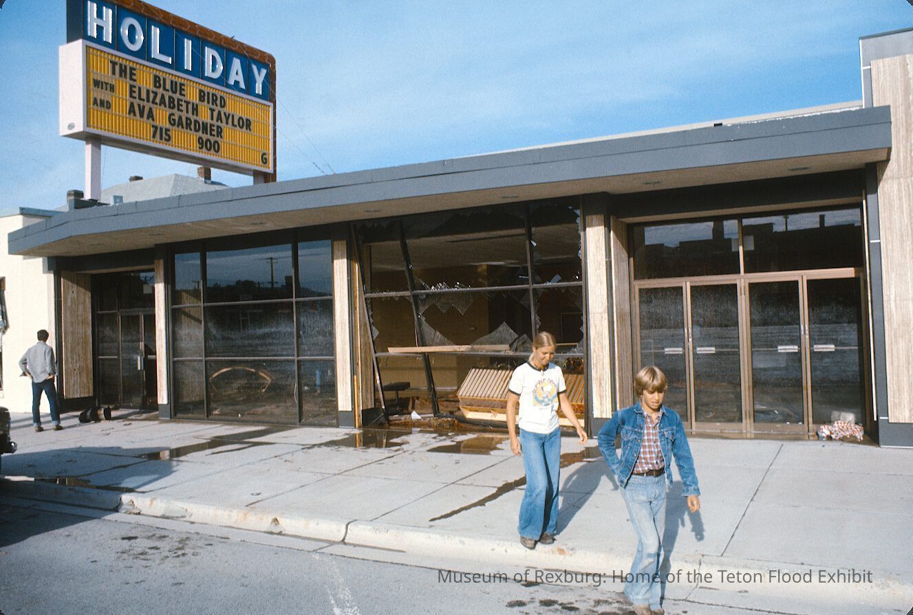 The photo was taken in colour. According to the donor the photo was also taken on the 7th of July. The subject of the photo is the Holiday movie theater. The front windows are shatters and many of the concession stands and other items were shifted around by the waters. In the foreground of the photo are two people. The foremost person has medium length hair, wearing a jean jacket, plaid shit, acid washed blue jeans with a belt and possibly work boots. The person behind them is wearing a white tea bell bottoms and boots. The right hand side of the photo has a person wearing a grey button up and black slacks staring at the right entrance to the theater. The photo is a part of a digital collection donated to the museum by Rick Davis.