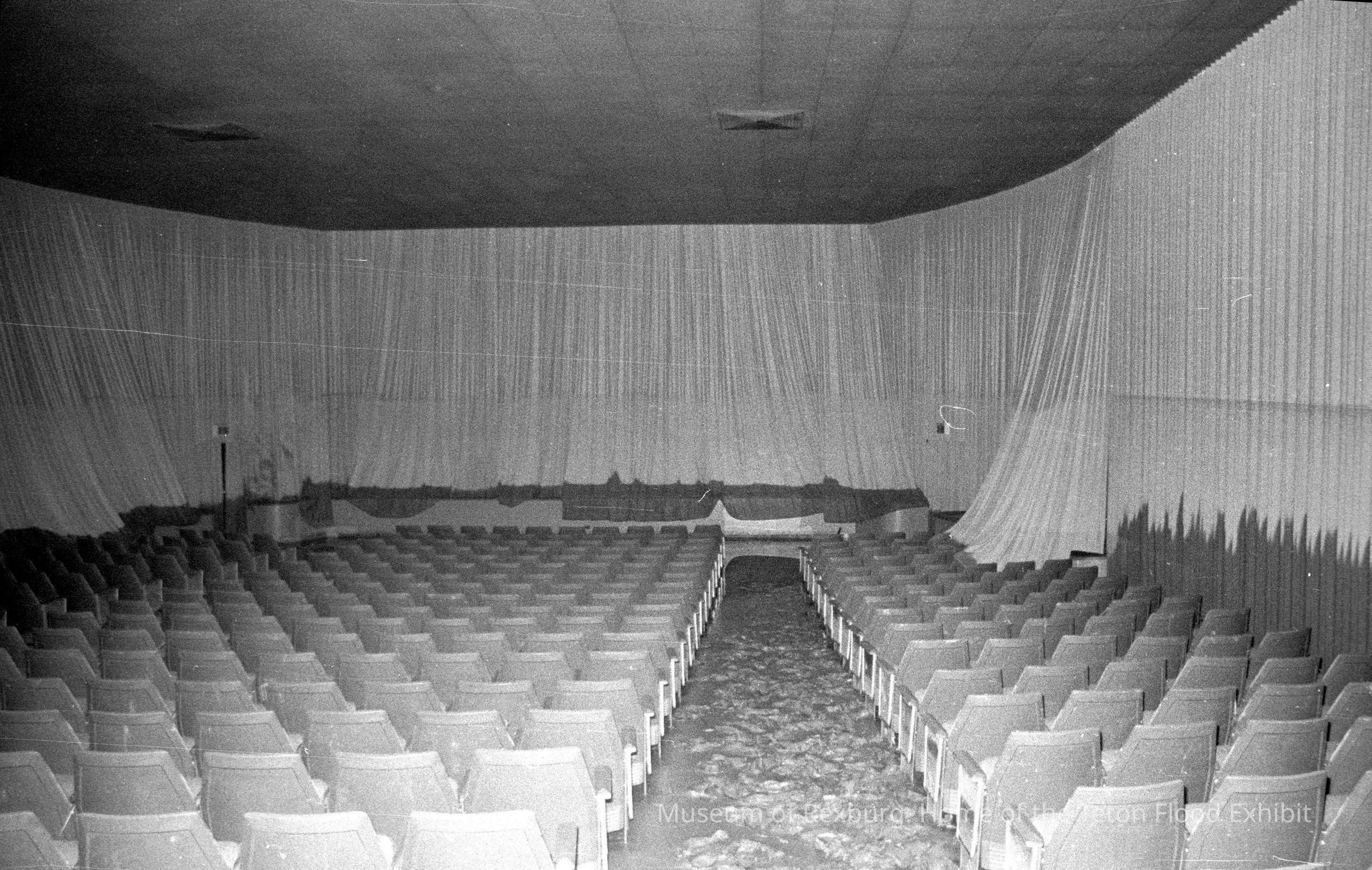 The photo was taken in black and white. The subject of the photo is the Holiday Theater's Theatre room. The floor is covered in mud. However, the chairs seem undisturbed by the gushing waters. The curtains that lined the walls seem to be stained at the bottom and untouched neat the top. The photo is a part of a digital collection donated to the museum by Rick Davis.