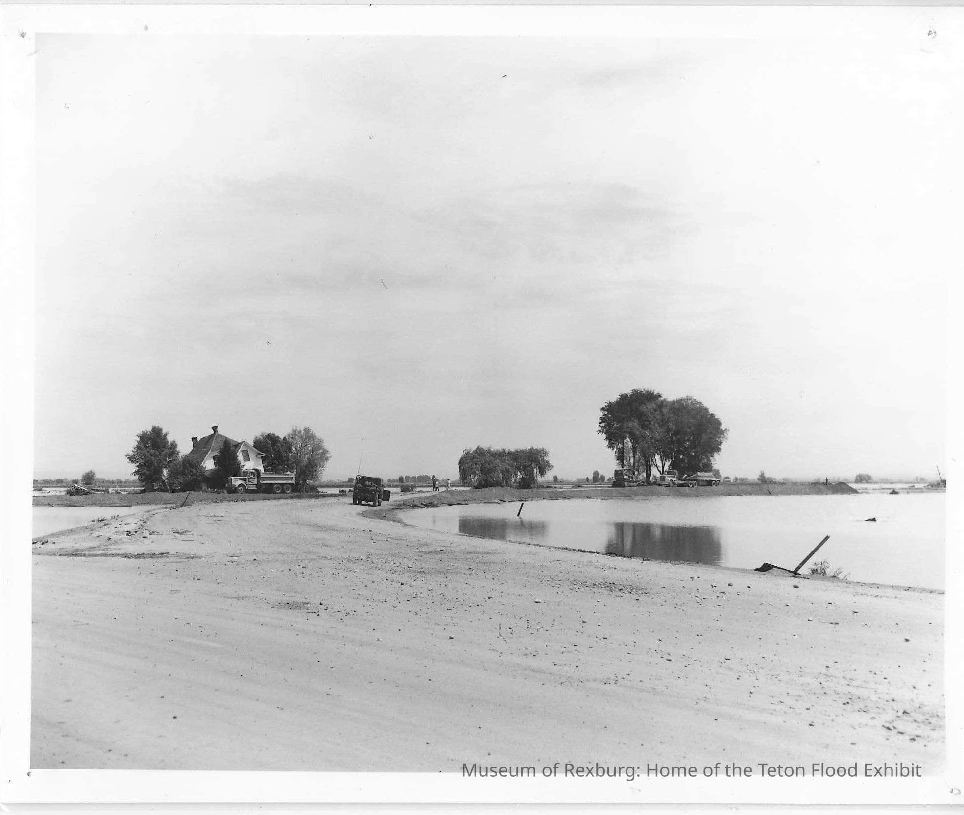 This photo is an 8x10 and is black and white and is also laminated. In the left center near the edge is a white home that looks like it off its foundation. It is sitting between trees, There is a large body of water on the right near the center edge. There are dump trucks and a jeep and people scattered around. The road around it is dirt.