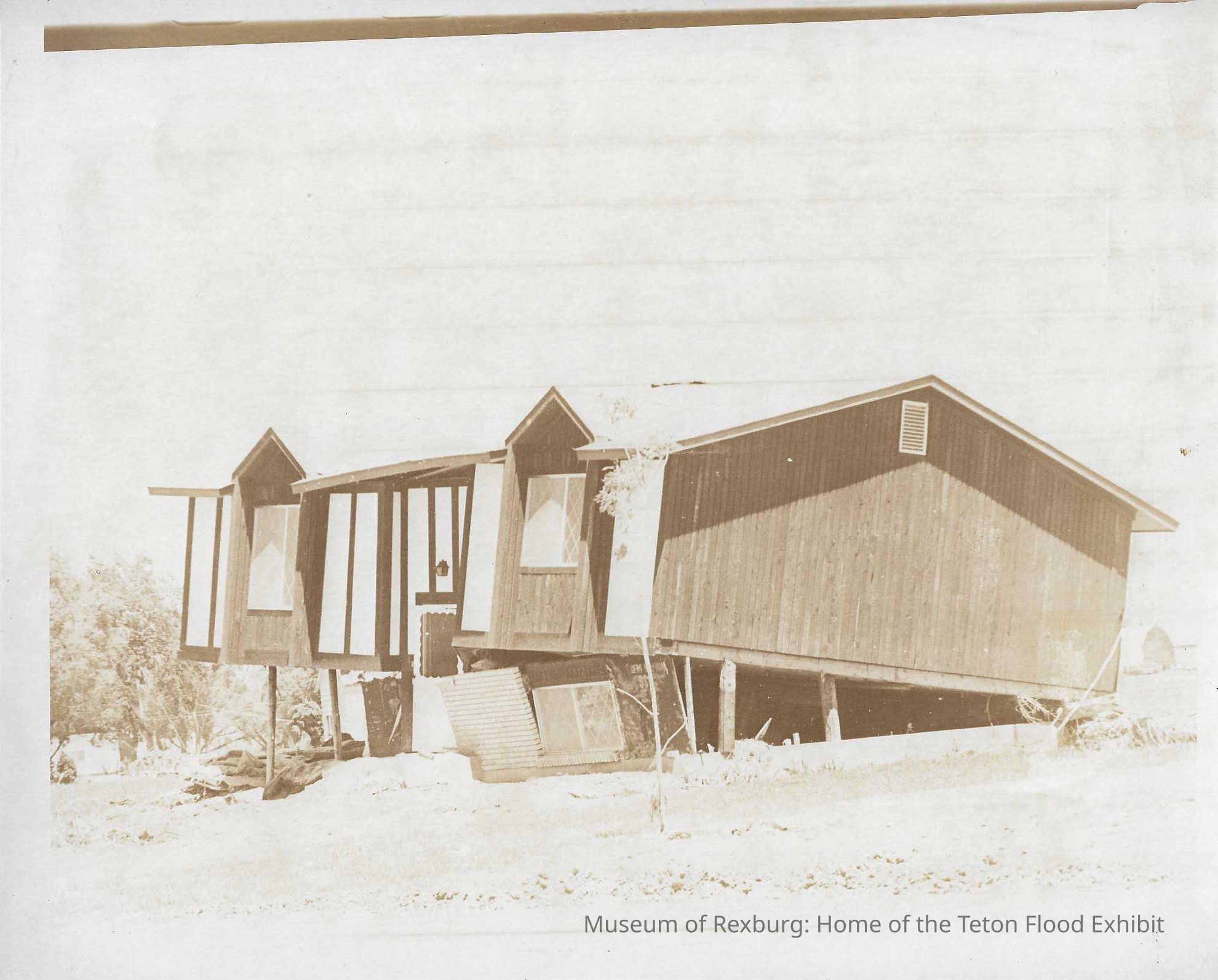This photo was contained in a brown folder with many other photos. There was a note on the front in cursive that said, "Thanks Dave Gaut". The majority of these photos appear to be taken from the Centennial that was held in Rexburg, ID along with a few of the flood and other misc. photos. This photo is black and white and is over - exposed. This photo shows a house that has been lifted up on stilts either on purpose or by the flood. The home is also crooked. This photo is 8 x 10 inches big. This photo comes from the old Standard Journal Warehouse located at 23 S 1st E.