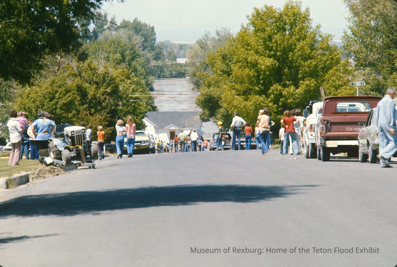 The photo was taken in colour. A group of people who sought shelter on higher ground are gathered together looking over the area that was flooded. The object of their focus is a whiter home floating pass the area below the hill. The house was uprooted from its foundation and became subject to the will of the water. The photo is a part of a digital collection donated to the museum by Rick Davis. This photo was taken on 3rd E 1st S.