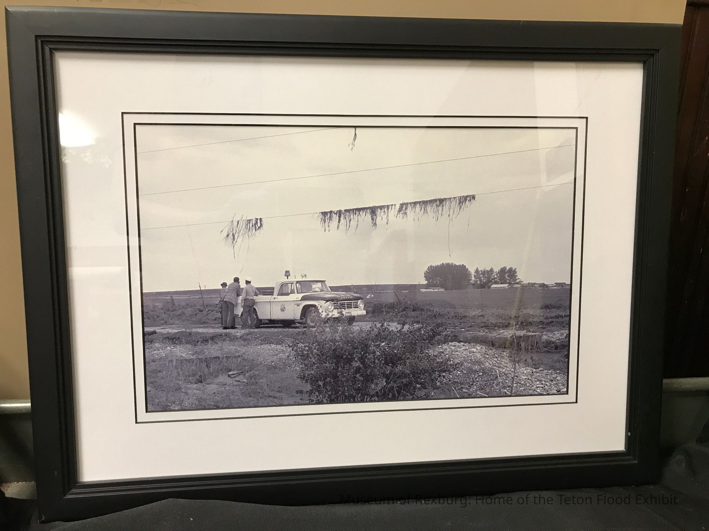 This photo is black and white and shows a City of Idaho Falls Dodge pickup with three men assessing the damage done to powerline. The very top of the powerline shows how high the wave reached and the bottom power line shows where it continued to flow. This photo is in a black frame and has a white border around the photo. This photo is on display in the flood room. On the back of the photo there is a small piece of paper that reads: "Idaho Falls upper power Plant 14 foot utility line flood debris" This photo is 19 x 24 inches big.