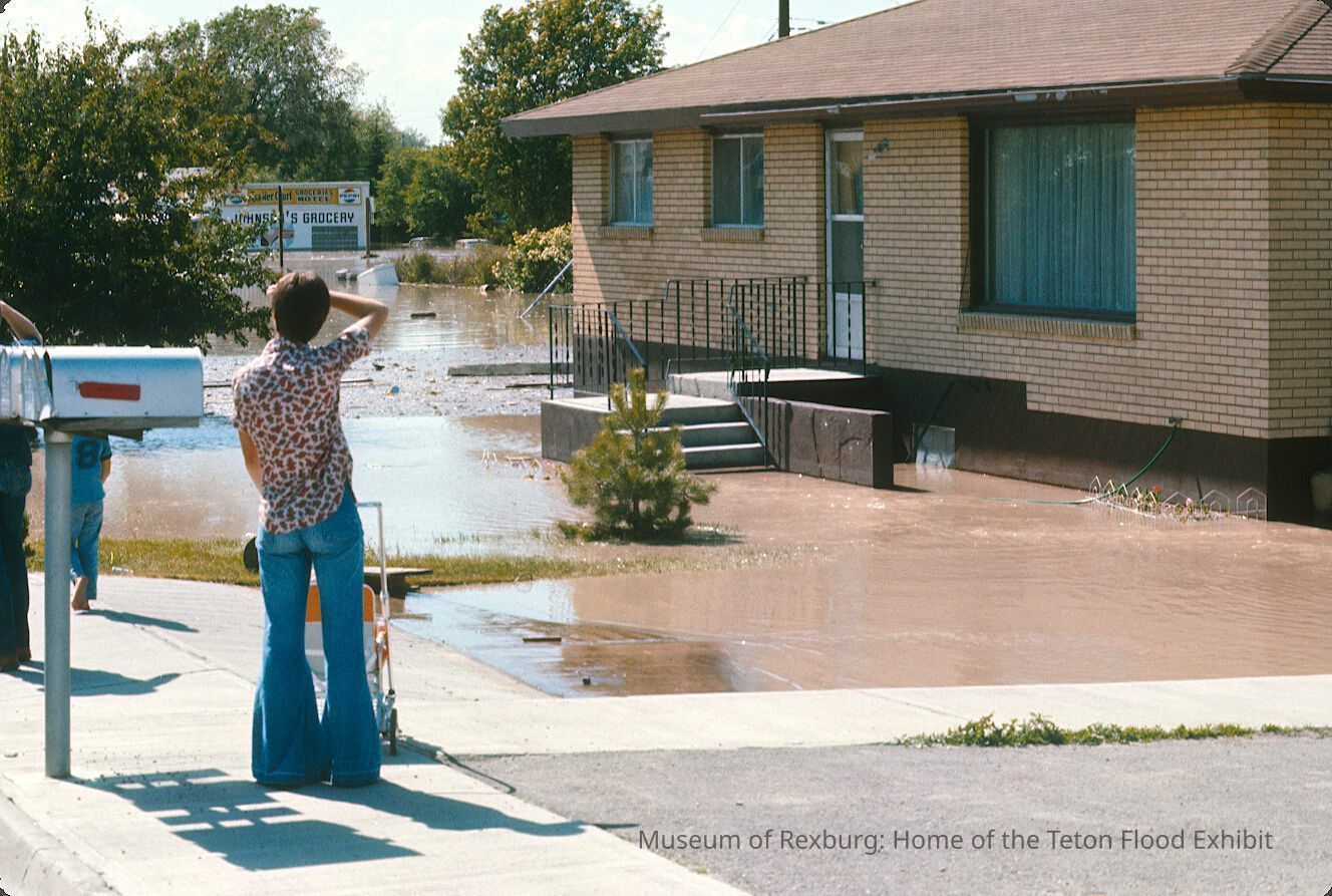 This photo was taken in colour. The subject of the photo is a portion of S 2nd W St. The right half of the photo is taken up by a cream brick home with a slight inclined roof. The building looks to be a single story with a furnished basement entrance. In shot to the left is a woman wearing a white button-up shirt with red floral print, bell-bottom jeans and pushing a stroller. She is facing away from the camera towards the area effected by the flood. The waters are a murky brown colour and they extend passed the road and go into a small wooded area. The photo is a part of a digital collection donated to the museum by Rick Davis.