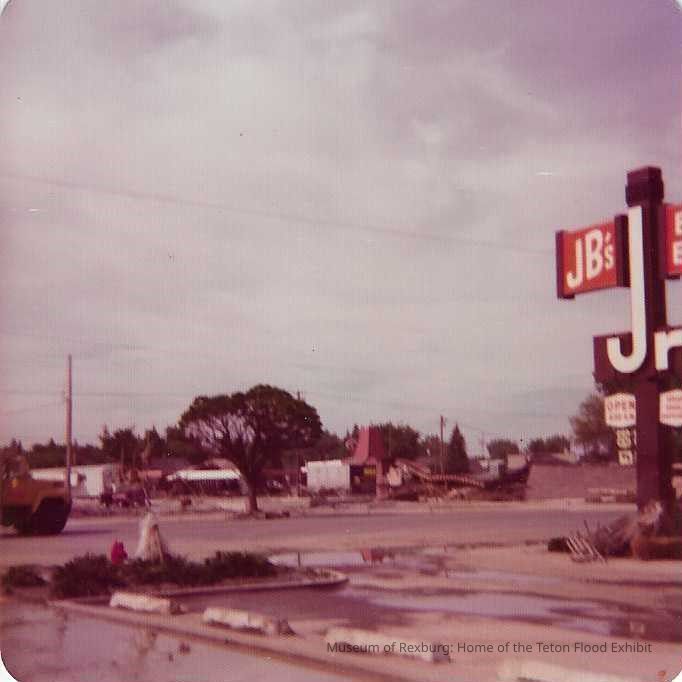 This photo is in color and shows the JB's restaurant sign to the right of the photo. There are also lots of debris scattered throughout this photo along with mud and small puddles. This photo is 3.5 x 3.5 inches big.