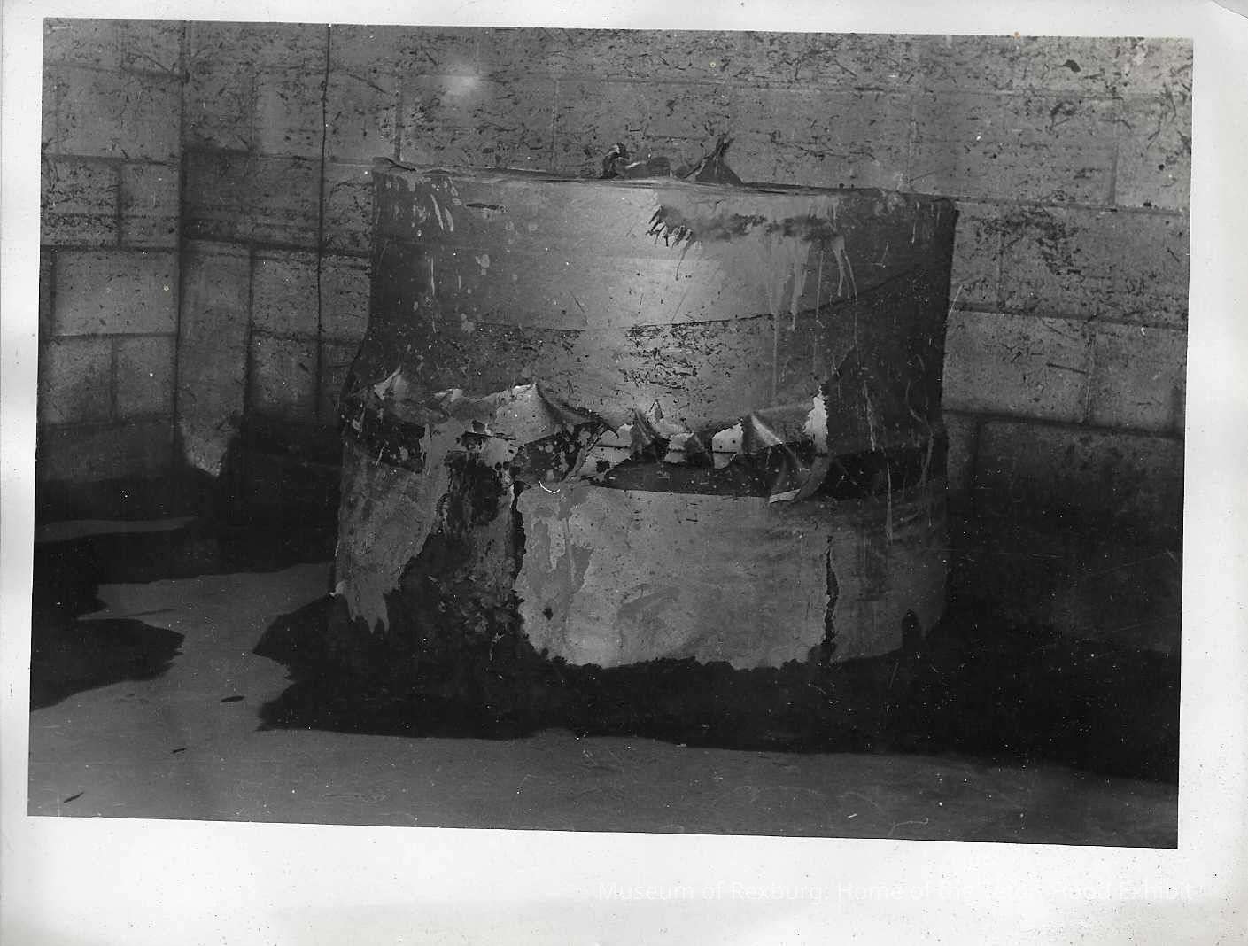 The photo is in black and white. The subject of the photo is a large cylindrical object that looks similar to a hay bale. However, it looks as though the object is in an enclosed space like a basement. The photo was originally from the Standard Journal's warehouse. This photo comes from the old Standard Journal Warehouse located at 23 S 1st E.