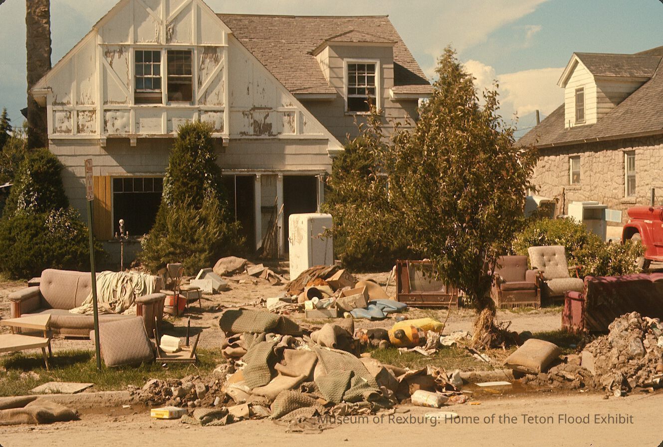 The photo was taken in colour. The subject of the photo is a white barn style house with debris n the front yard. The paint on the house is peeling, bubbling, and the shingles are falling off the roof as well. The front yard is littered with furniture, appliances, garbage, and other debris. The house is a two story house. According to Rick Davis this house is just east of the Courthouse. The photo is a part of a digital collection donated to the museum by Rick Davis.