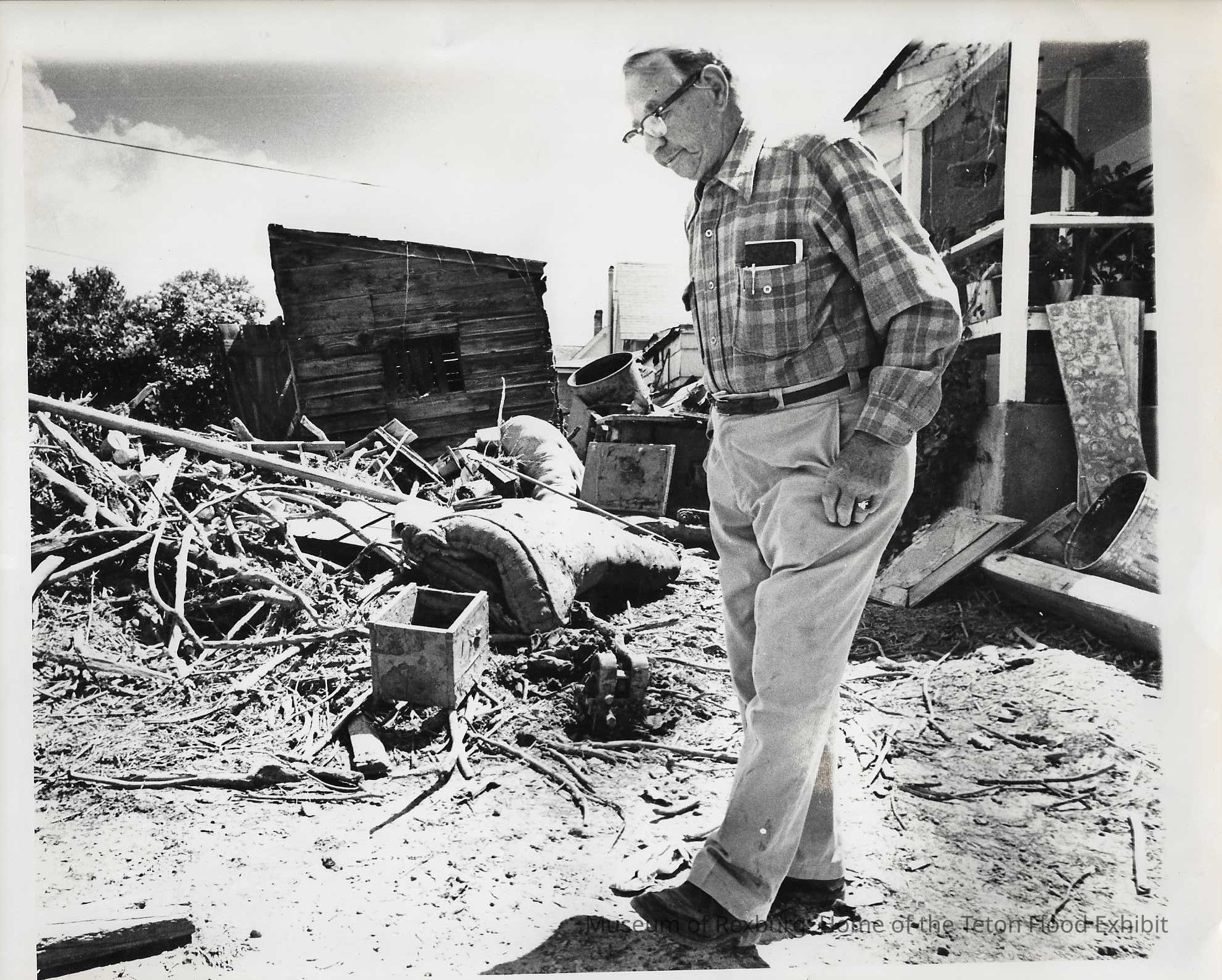 This photo is black and white and shows an elderly gentleman wearing a plaid shirt walking through debris left behind by the flood waters. He appears to be assessing the damage and debris left behind by the flood. On the back of this photo it reads, "Treasured Memories". This photo is 8 x 10 inches big. This photo comes from the old Standard Journal Warehouse located at 23 S 1st E.