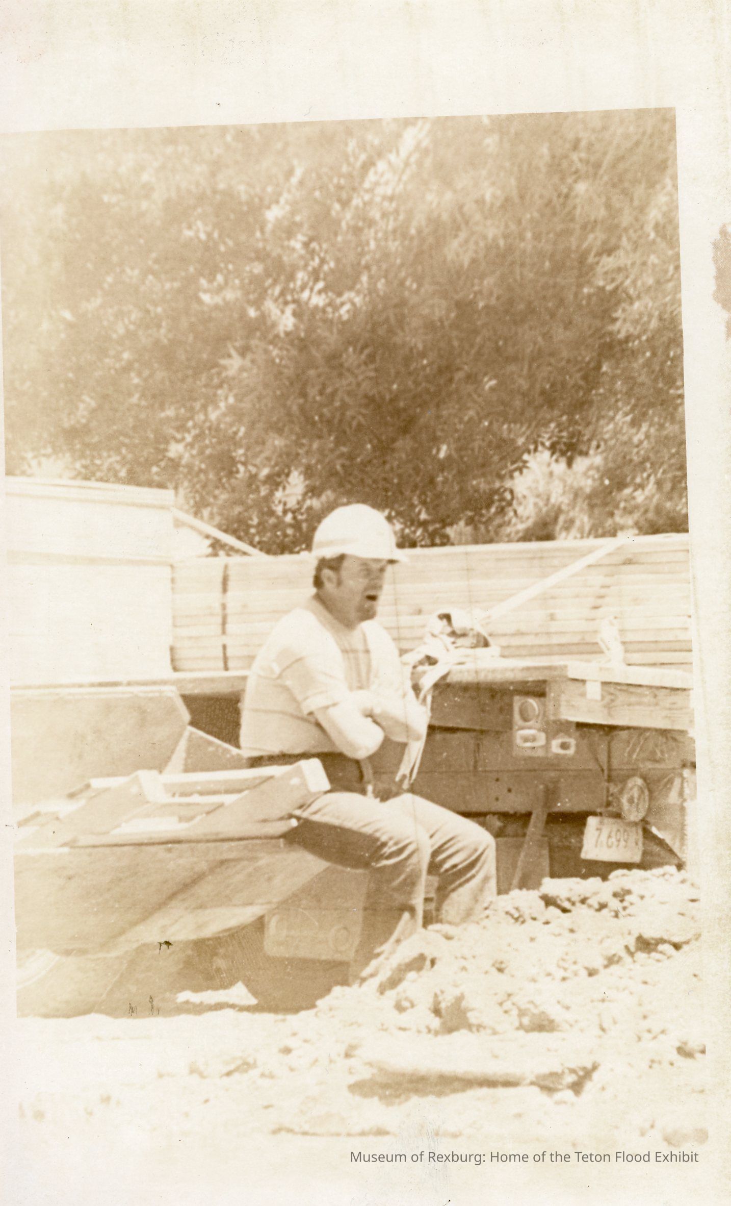 The photo is in black and white. The photo looks as though it had over saturated. The Subject of the photo is a man who is wearing a hard hat who is sitting on the crane arm. In the shovel portion of the arm is debris and other materials. In the background are some trees, and in front of the those trees are a couple of trucks loaded with logs. The man is sitting with his arms folded. In front of the man is a pile of debris. The man is wearing a construction vest. The dimensions of the photo are 8" X 5". This photo was contained in a brown envelope with "Thanks Dave Gauts" written in Cursive This photo comes from the old Standard Journal Warehouse located at 23 S 1st E.