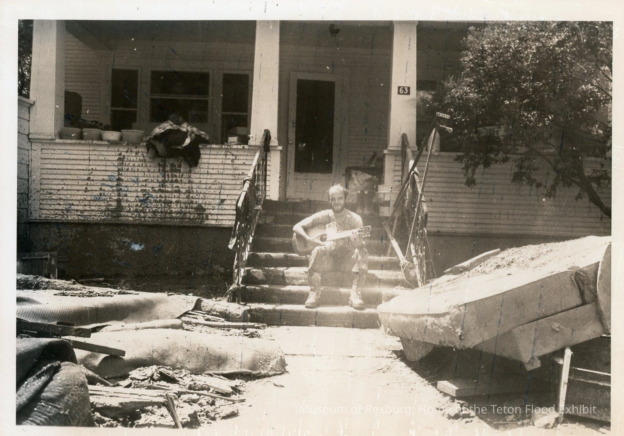 There is writing on the back, the caption reads "A Little Music Might Help". It also says "Flood 150%". It is a B&W photo showing a bearded man sitting on the steps of a house, smiling and playing guitar. There is mud on the side of the porch to the man's right. In front of him are mattresses, rolls of carpet, other debris and mud. There is also debris on the steps behind him and on the porch. The house is old fashioned, possibly craftsman style, and has the number 63 on it. This photo is 5x7". This photo comes from the old Standard Journal Warehouse located at 23 S 1st E.