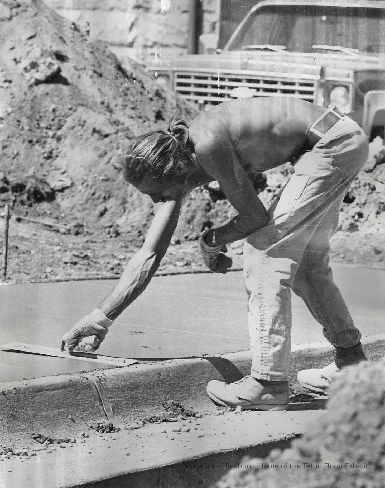 This photo is black and white and shows a man leaning over to scrape the cement so that it is flat and all the bubbles are gone. He is not wearing a shirt. There is a pile of dirt in the background. This photo was stuck to other photos and evidence of that is the damage to the very top of the photo on the front and the two residue stripes on the left and right side on the back. This photo is 7.5 x9.25 inches big. This photo comes from the old Standard Journal Warehouse located at 23 S 1st E. This photo was cleaned on 01/10/2021 to try and remove the glue residue.