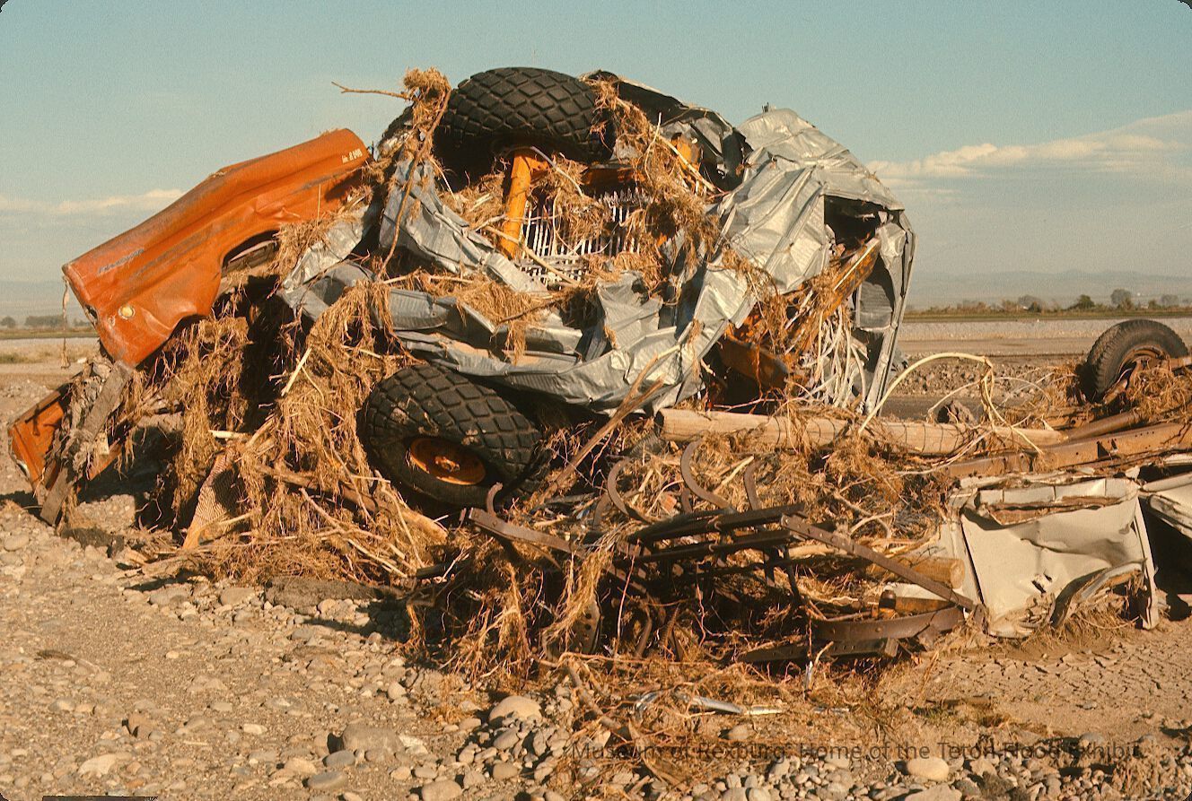 The photo was taken in colour. The subject of the photo is a debris pile in the Wilford area. The debris consists of foliage, farm equipment, and a mangled dump truck. The truck seems to have been beaten up by the waves of the flood. The chassis is bent and twisted with the body of the truck pushed in on itself and twisted with the chassis. The photo is a part of a digital collection donated to the museum by Rick Davis.