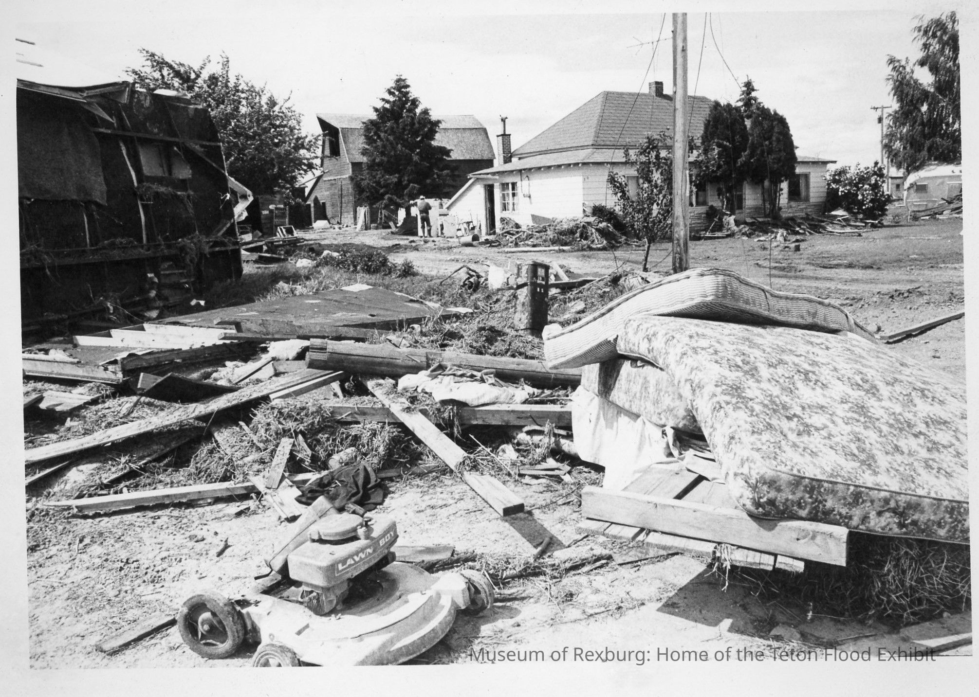 This B&W photo shows a barn and farmhouse in the background and debris in the foreground. There's a note on the back that says "Sugar" so this may be in Sugar City. To the left is a lawn mower with the label "Lawn Boy" on it. To the right of this are several mattresses piled on top of each other as well as boards, wooden planks and other flood debris. To the left of all this is a large vehicle or trailer on it's side. Back by the house is a man with his back to the camera. To the left of the man is a tall tree, behind which is the barn. There are notes on the back: "Sugar 90% 120% (crossed out) Not used yet." This photo is 5x7". This photo comes from the old Standard Journal Warehouse located at 23 S 1st E.