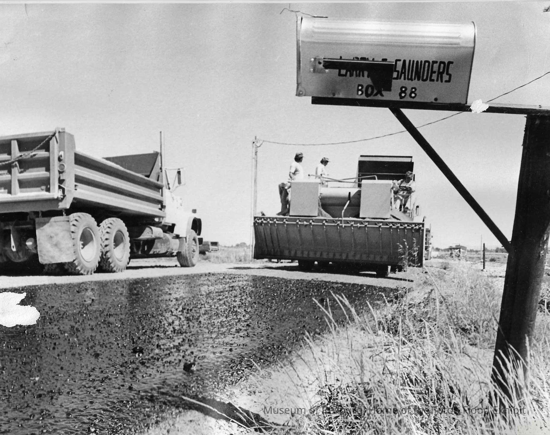 This photo is black and white and shows a dump truck and other pieces of heavy equipment. There are three men sitting on the piece of equipment to the right of the photo. To the far right of the photo in the foreground is a mailbox, the flag is down so we can't read the first name but the last name is Saunders and it is Box 88. This photo had photos stuck to the back of the photo so there is damage to the top edge on the back and there are a few tears on the front towards the left bottom edge and in the upper right hand corner. This photo is 7.5 x9.25 inches big. This photo comes from the old Standard Journal Warehouse located at 23 S 1st E.