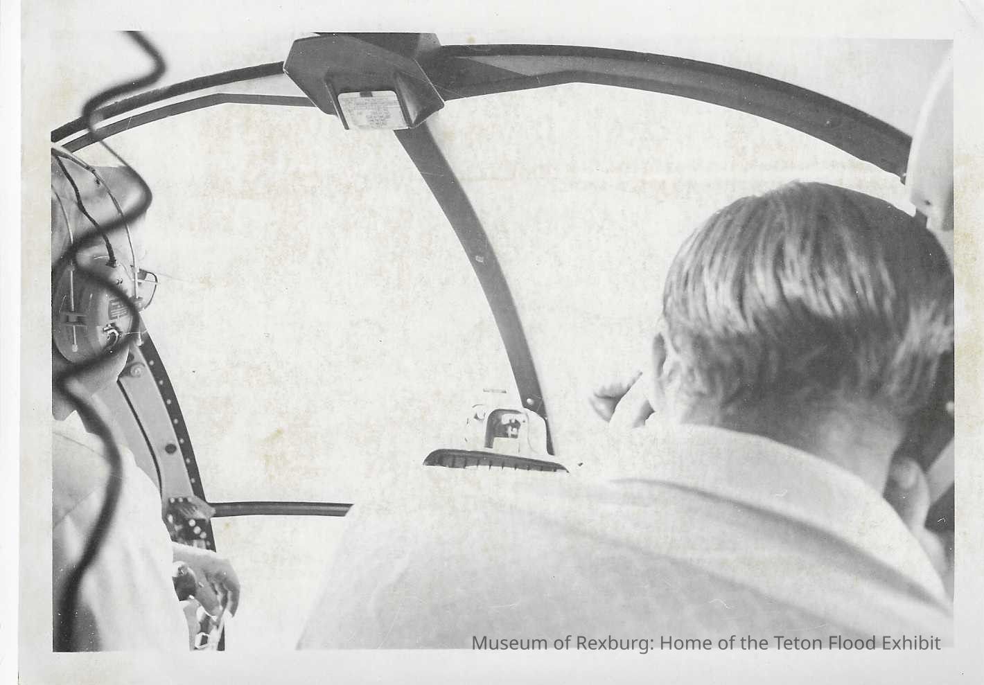This photo was contained in a brown folder with many other photos. There was a note on the front in cursive that said, "Thanks Dave Gaut". The majority of these photos appear to be taken from the Centennial that was held in Rexburg, ID along with a few of the flood and other misc. photos. This photo is black and white and shows two men in an aerial vehicle. This vehicle could be a plane or a helicopter. The man to the right of the photo appears to be on the phone, most likely warning alerting the surrounding communities to the impending danger. The man to the left appears to be piloting the aerial vehicle. This photo is 5 x 7 inches big. This photo comes from the old Standard Journal Warehouse located at 23 S 1st E.