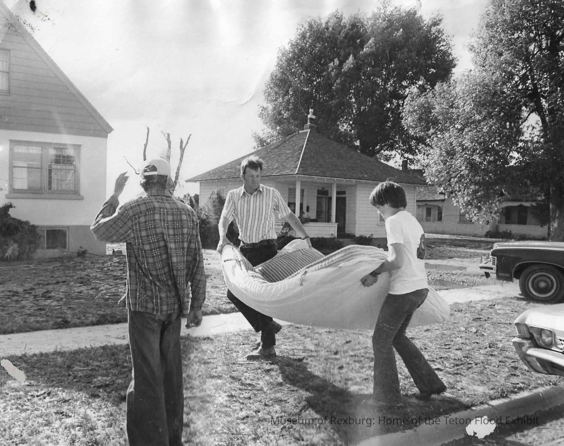 This photo is black and white and shows three people carrying a mattress over a lawn. Two of them are men while one is a young boy. Flood debris can be seen in the gutter of the road in the foreground. This photo was stuck to other photos. We can see rips on the bottom right and left hand corners. We can also see glue residue on the back on the top and bottom edge. This photo is 7.5 x9.25 inches big. This photo comes from the old Standard Journal Warehouse located at 23 S 1st E.
