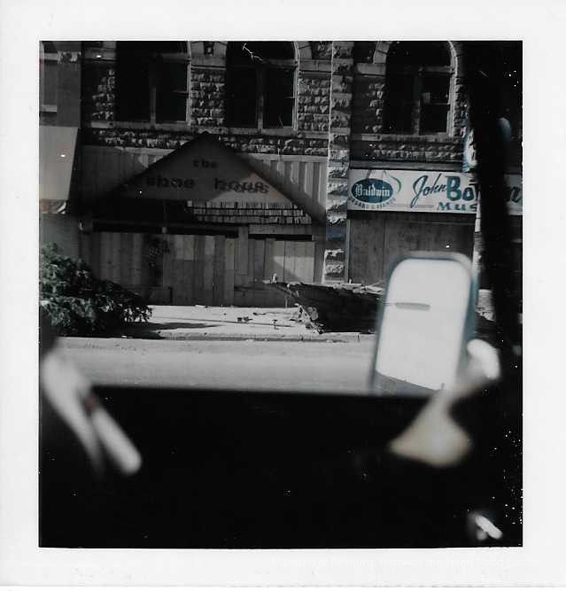 This photo is in color and is a polaroid photo. This photo is taken from a vehicle looking out. This photo shows Merlin's show store Main Street. This photo is 3.25 x 3.25 inches big.