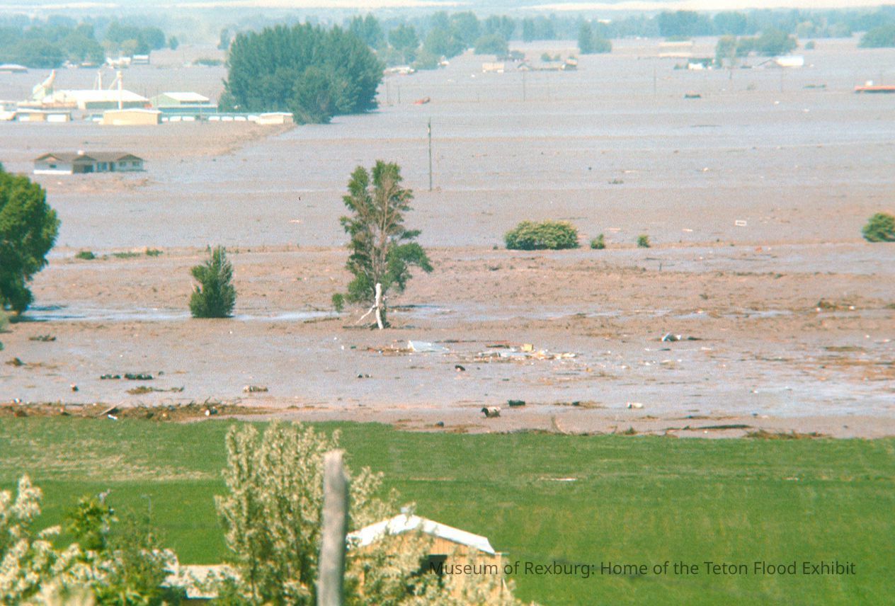 The photo was taken in colour. The subject of the photo is the Mill Hollow are in Sugar City. This photo was taken some time after the flood waters hit the area. Homes, cars and other man made objects we completely devastated, not even the foliage was saved. In the foreground of the shot is a shed on a green patch of land yet to be touched by the force of the water. The photo is a part of a digital collection donated to the museum by Rick Davis.