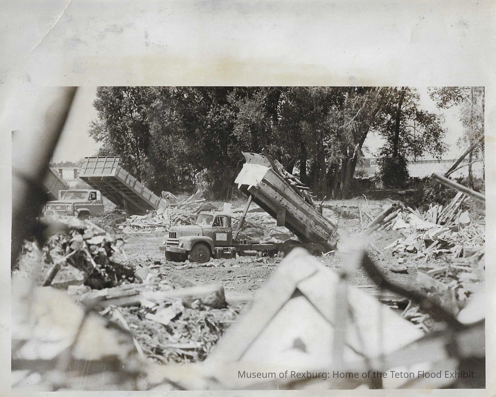 This photo is black and white and shows two dump trucks unloading the debris they have collected. We can also multiple piles of debris in this photo. There appears to be lots of wooden type debris. This photo is 8 x 10 inches big. On the back of the photo it reads, "Mountain of Debris 100%". This photo comes from the old Standard Journal Warehouse located at 23 S 1st E.