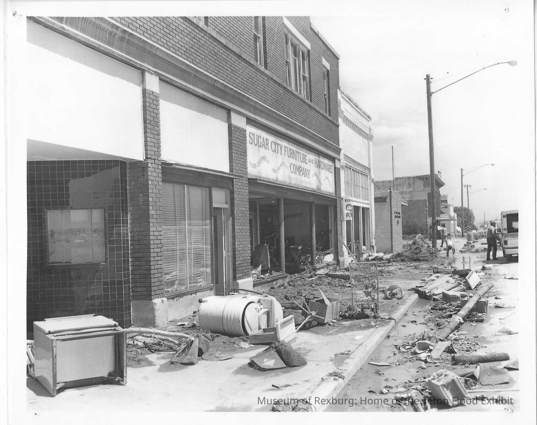 This photo is laminated. This photo is 8 x 10 inches. This photo is black and white. This photo shows the North side of Sugar City's Main Street looking east. This photo shows a lot of debris that is piled out in the street to be removed later. This photo shows the front of the Sugar City Furniture and Hardware Company. There is three people visible in the photo, however, there could be a fourth but he/she is hidden behind someone else.