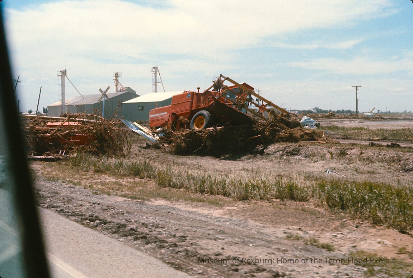 This photo was taken in colour. The subject of the photo is a processing plant and farming debris. The centre of the shot contains a Red Tractor on top of a pile of debris. The photo appears to have been taken from the interior of a car. The glass small window takes up the left side of the photo. The photo was taken on a clear day. The photo is a part of a digital collection donated to the museum by Rick Davis.