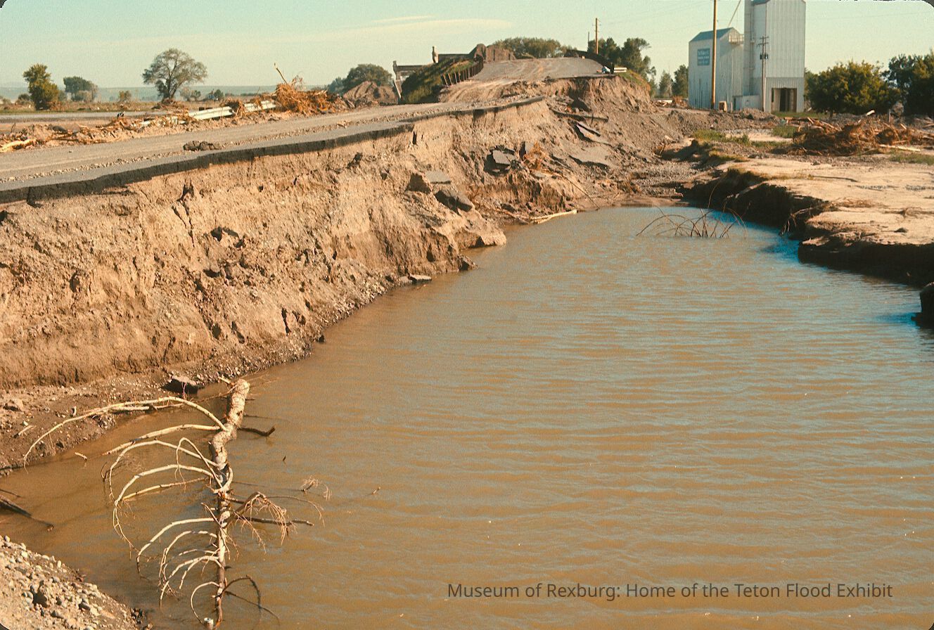 The photo was taken in colour. The subject of the photo is the north end of the Sugar City overpass. Most of the road has collapsed leaving a small sliver of road leading to the bridge. The foreground of the photo contains muddy water. In the background there are two white buildings that look like a mill of some sorts. he photo is a part of a digital collection donated to the museum by Rick Davis.