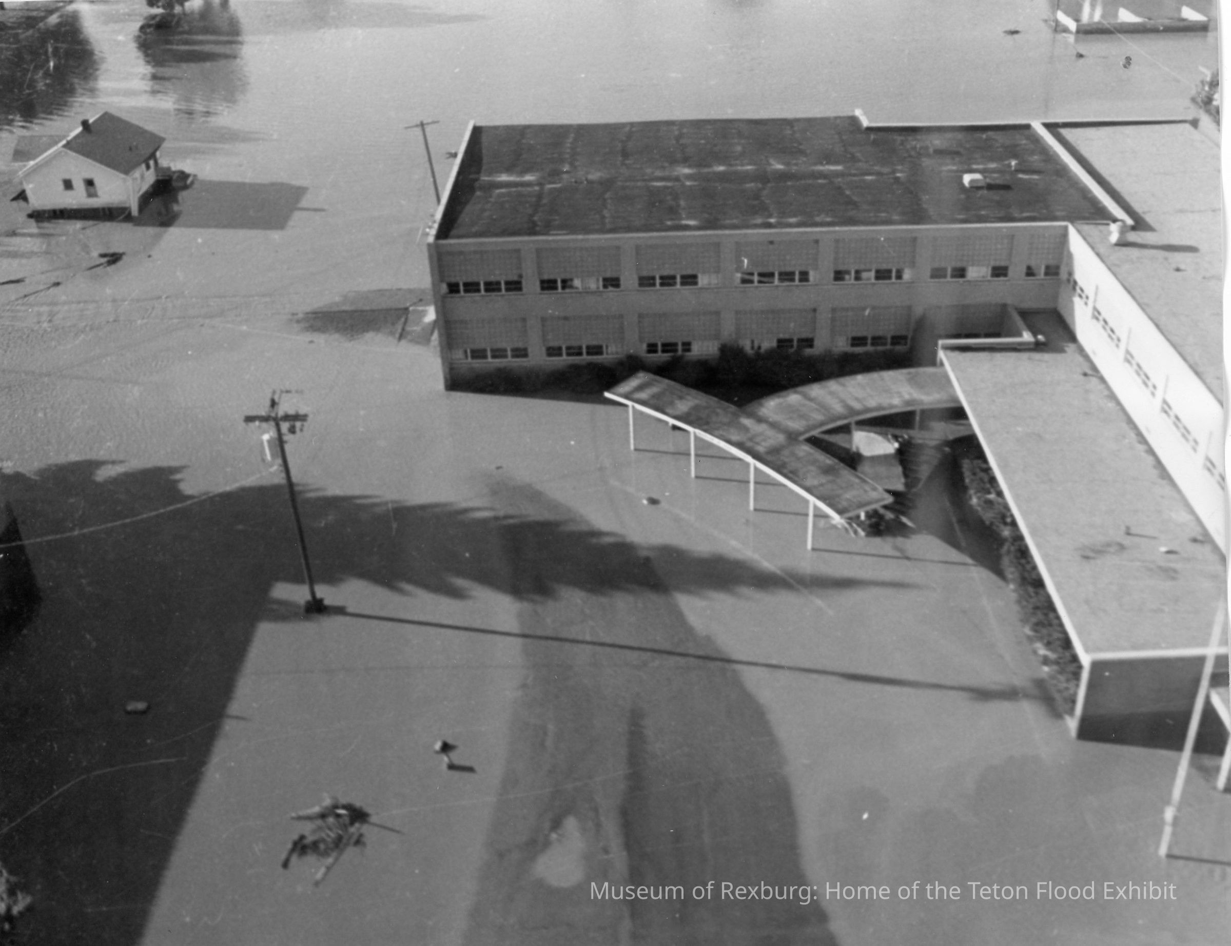 This is a close oblique view of the Madison High School taken from a plane. The school takes up the middle and right hand side of the photo. An electrical pole is to the left and in the upper left hand corner is a white house. The reflection of trees can be seen above it. Flood water is all throughout the picture, flooding the school and the house. This picture is 9.25x7.25. This photo comes from the old Standard Journal Warehouse located at 23 S 1st E. Same as 2021-20-255.